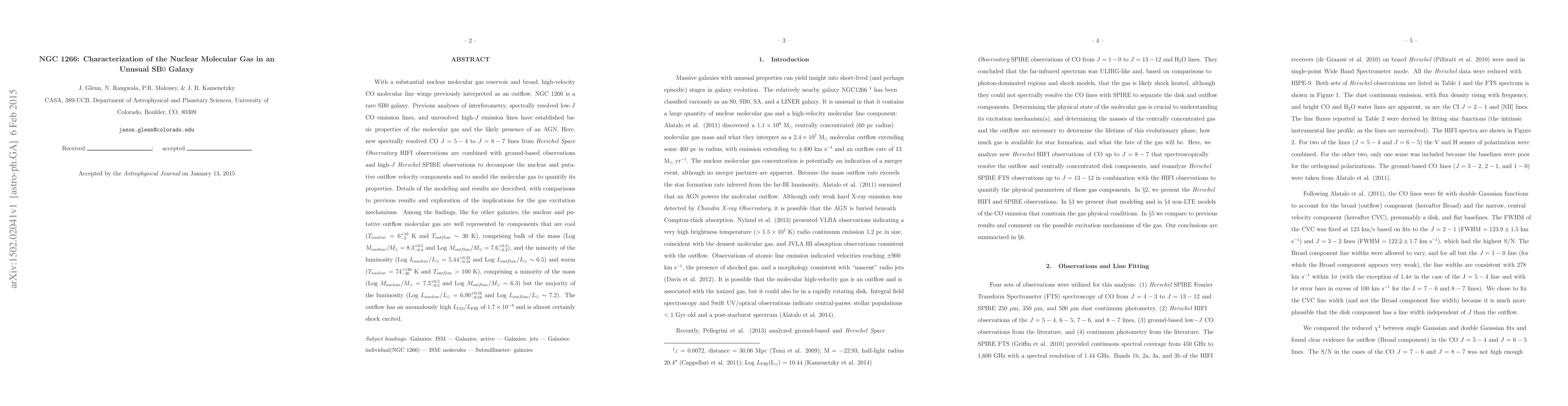 With a substantial nuclear molecular gas reservoir and broad, high-velocity CO molecular line wings previously interpreted as an outflow, NGC 1266 is a rare SB$0$ galaxy. Previous analyses of interferometry, spectrally resolved low-$J$ CO emission lines, and unresolved high-$J$ emission lines have established basic properties of the molecular gas and the likely presence of an AGN. Here, new spectrally resolved CO $J = 5 - 4$ to $J = 8 - 7$ lines from {\it Herschel Space Observatory} HIFI observations are combined with ground-based observations and high-$J$ {\it Herschel} SPIRE observations to decompose the nuclear and putative outflow velocity components and to model the molecular gas to quantify its properties. Details of the modeling and results are described, with comparisons to previous results and exploration of the implications for the gas excitation mechanisms. Among the findings, like for other galaxies, the nuclear and putative outflow molecular gas are well represented by components that are cool ($T_{nuclear} = 6^{+10}_{-2}$ K and $T_{outflow} \sim 30$ K), comprising bulk of the mass (Log $M_{nuclear}/M_{\odot} = 8.3^{+0.5}_{-0.4}$ and Log $M_{outflow}/M_{\odot} = 7.6^{+0.3}_{-0.3}$), and the minority of the luminosity (Log $L_{nuclear}/L_{\odot} = 5.44^{+0.22}_{-0.18}$ and Log $L_{outflow}/L_{\odot} \sim 6.5$) and warm ($T_{nuclear} = 74^{+130}_{-26}$ K and $T_{outflow} > 100$ K), comprising a minority of the mass (Log $M_{nuclear}/M_{\odot} = 7.3^{+0.5}_{-0.5}$ and Log $M_{outflow}/M_{\odot} \sim 6.3$) but the majority of the luminosity (Log $L_{nuclear}/L_{\odot} = 6.90^{+0.16}_{-0.16}$ and Log $L_{outflow}/L_{\odot} \sim 7.2$). The outflow has an anomalously high $L_\mathrm{CO}/L_\mathrm{FIR}$ of $1.7 \times 10^{-3}$ and is almost certainly shock excited.
