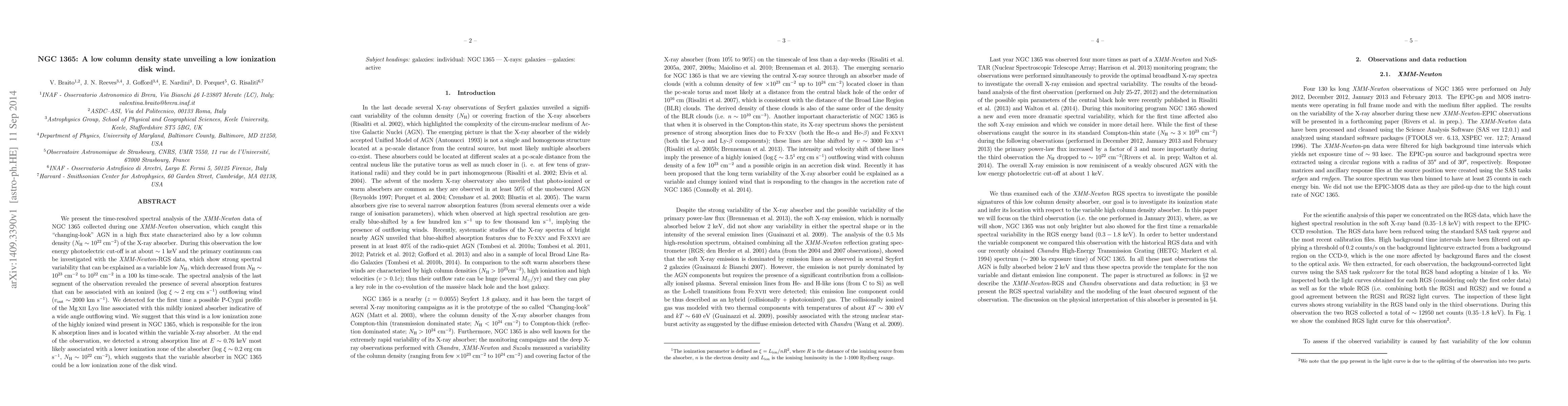 This study reveals a low column density state in NGC 1365, detected via XMM-Newton data, showing spectral variability and a low ionization outflowing wind. The analysis suggests the presence of a low ionization disk wind, evidenced by absorption features and a P-Cygni profile.