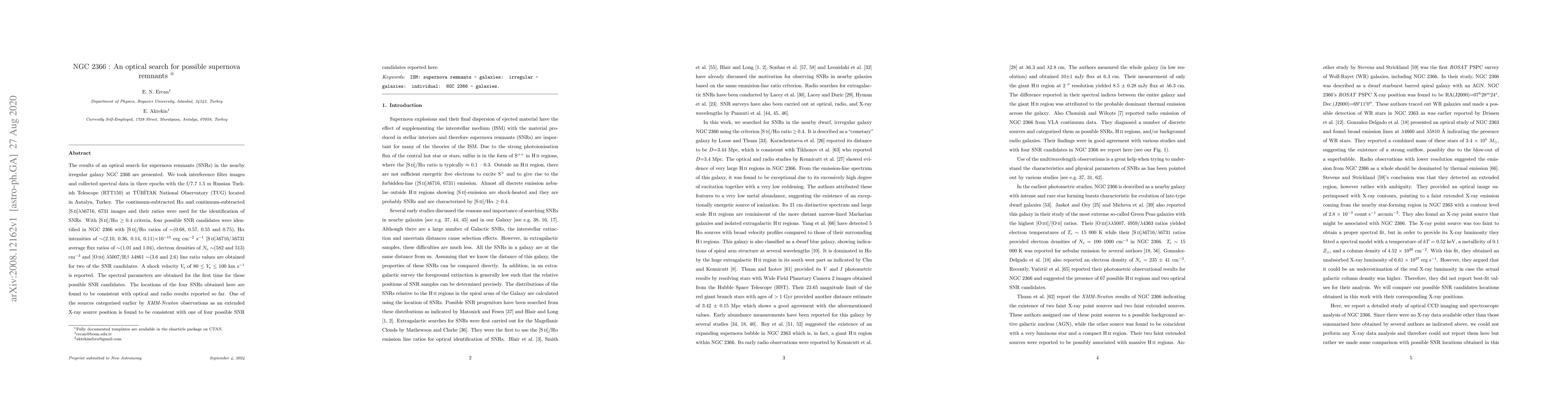 The results of an optical search for supernova remnants (SNRs) in the nearby irregular galaxy NGC 2366 are presented. We took interference filter images and collected spectral data in three epochs with the f/7.7 1.5 m Russian Turkish Telescope (RTT150) at T\"{U}B\.{I}TAK National Observatory (TUG) located in Antalya, Turkey. The continuum-subtracted H$\alpha$ and continuum-subtracted [SII]$\lambda \lambda$6716, 6731 images and their ratios were used for the identification of SNRs. With [SII]/H$\alpha$ $\geq$ 0.4 criteria, four possible SNR candidates were identified in NGC 2366 with [SII]/H$\alpha$ ratios of $\sim$(0.68, 0.57, 0.55 and 0.75), H$\alpha$ intensities of $\sim$(2.10, 0.36, 0.14, 0.11)$\times 10^{-15}$ erg cm$^{-2}$ s$^{-1}$ [SII]$\lambda$6716/$\lambda$6731 average flux ratios of $\sim$(1.01 and 1.04), electron densities of $N_{\rm e}$ $\sim$(582 and 513) cm$^{-3}$ and [OIII] $\lambda$5007/H$\beta$ $\lambda$4861 $\sim$(3.6 and 2.6) line ratio values are obtained for two of the SNR candidates. A shock velocity $V_{\rm s}$ of 80 $\leq$ $V_{\rm s}$ $\leq$ 100 km s$^{-1}$ is reported. The spectral parameters are obtained for the first time for these possible SNR candidates. The locations of the four SNRs obtained here are found to be consistent with optical and radio results reported so far. One of the sources categorised earlier by XMM-Newton observations as an extended X-ray source position is found to be consistent with one of four possible SNR candidates reported here.