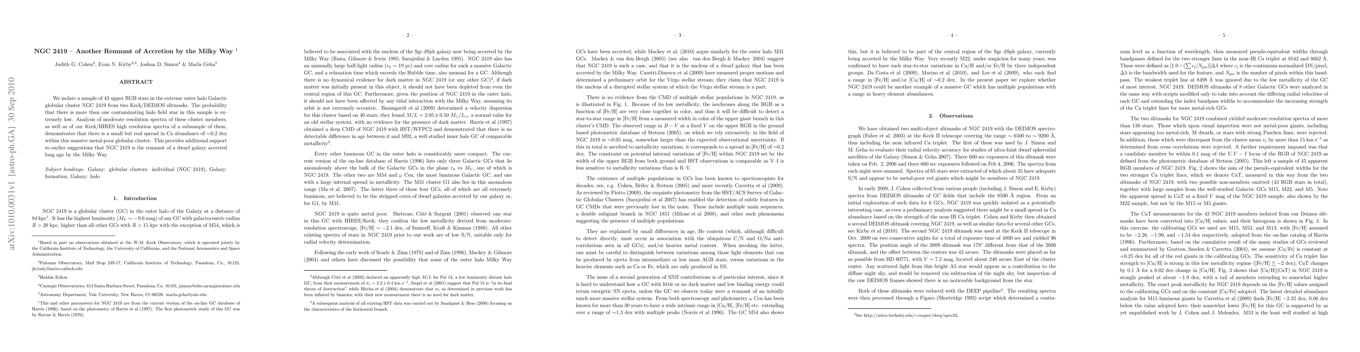 This study analyzes 43 upper RGB stars in NGC 2419, a globular cluster in the Milky Way's extreme outer halo, revealing a small but significant spread in calcium abundance, suggesting it may be a remnant of a dwarf galaxy accreted by the Milky Way. The low probability of contamination supports the cluster's unique origin.