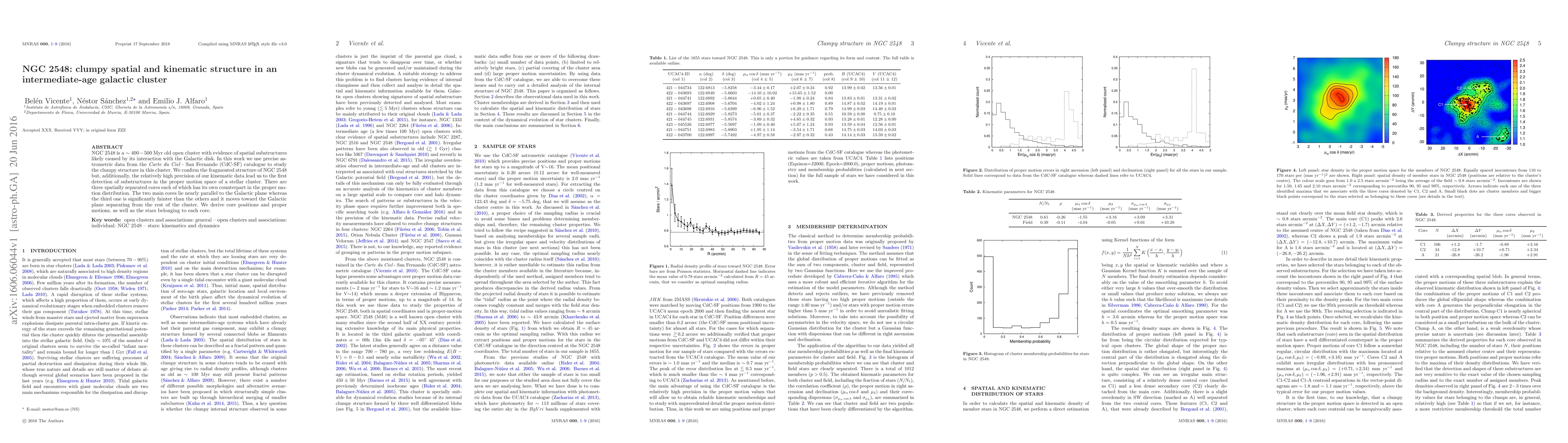 This study reveals NGC 2548's fragmented spatial and kinematic structure, identifying three distinct cores with unique proper motions, suggesting interaction with the Galactic disk. The precise astrometric data confirms the cluster's clumpy nature and highlights a third core moving differently from the main cluster.