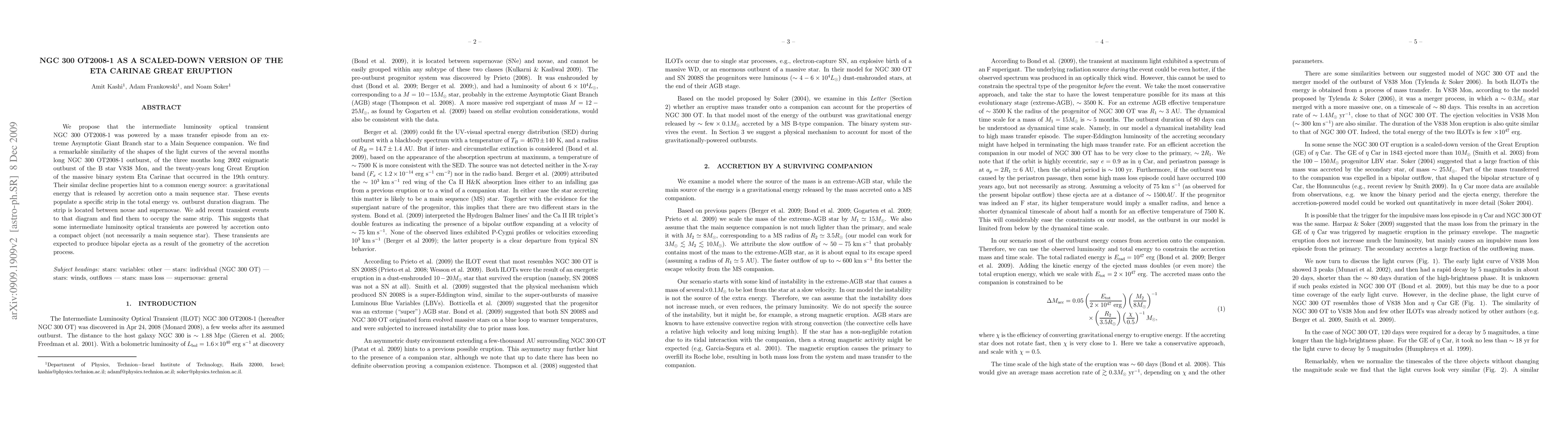 The research proposes NGC 300 OT2008-1 was an intermediate luminosity optical transient powered by mass transfer from an evolved star to a main sequence companion, showing similarities to the Great Eruption of Eta Carinae. This suggests a common energy source of gravitational energy from accretion onto a main sequence star, with these events falling in a specific energy vs. duration diagram range, and potentially producing bipolar ejecta.