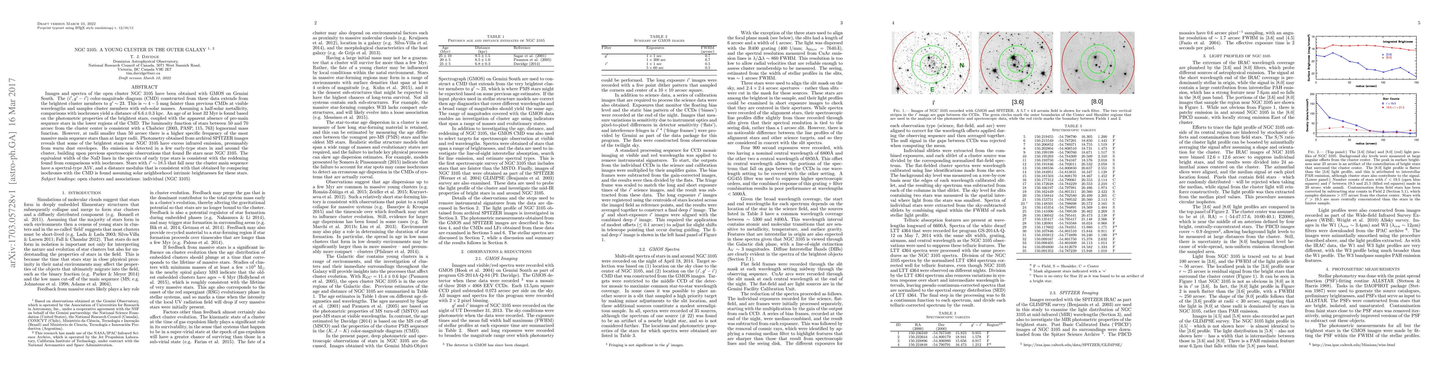 NGC 3105 is a young open cluster with an age of at least 32 Myr, located 6.6±0.3 kpc away. The cluster exhibits a higher specific frequency of massive stars closer to the center, and some stars show infrared excess indicative of warm dust.