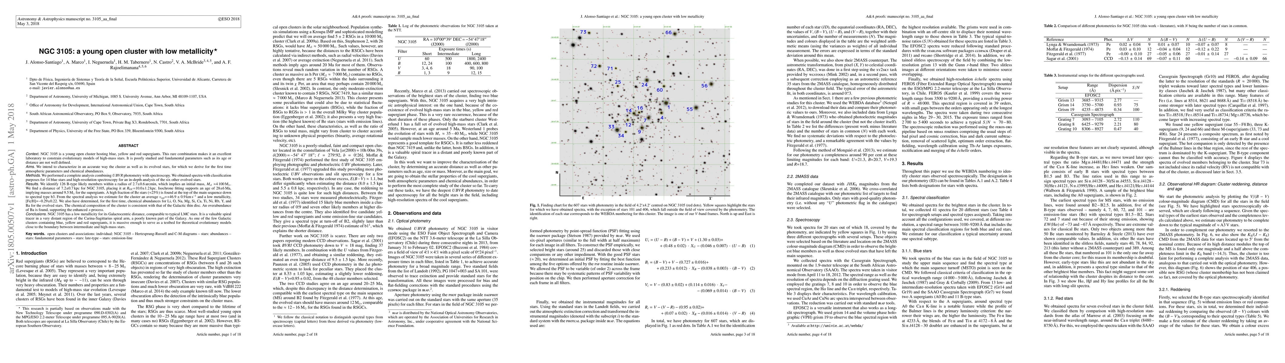 NGC 3105 is a young open cluster with a rare combination of blue, yellow, and red supergiants, providing a unique opportunity to study the evolution of high-mass stars. The cluster has an estimated age of 28±6 Ma, a distance of 7.2±0.7 kpc, and a low metallicity of [Fe/H]=-0.29±0.22, making it a valuable tracer in the distant Carina-Sagittarius spiral arm.