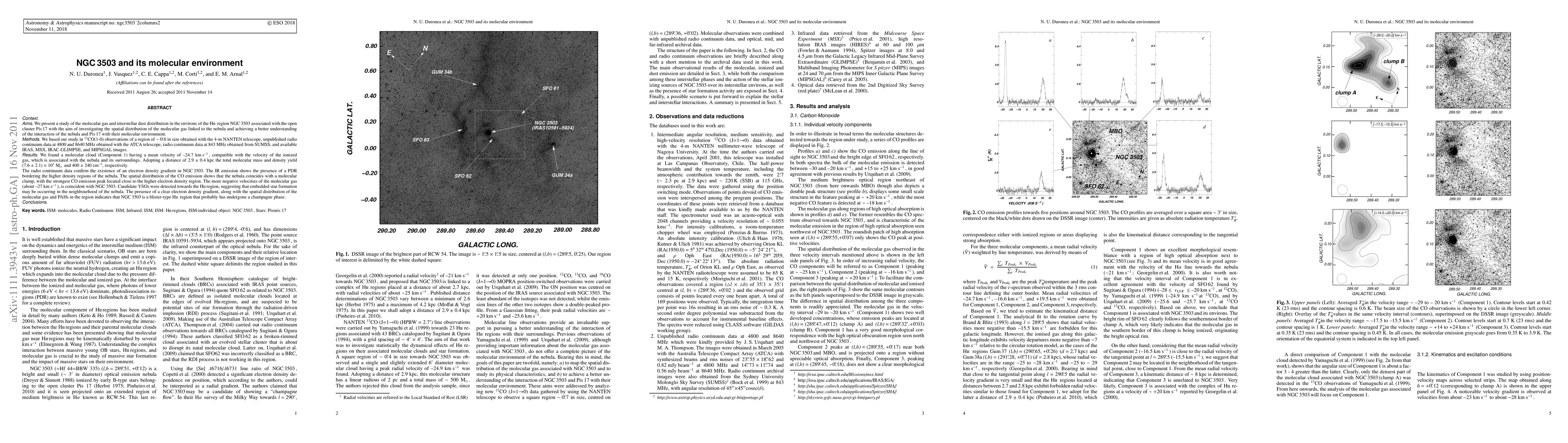 We present a study of the molecular gas and interstellar dust distribution in the environs of the HII region NGC 3503 associated with the open cluster Pis 17 with the aim of investigating the spatial distribution of the molecular gas linked to the nebula and achieving a better understanding of the interaction of the nebula and Pis 17 with their molecular environment. We based our study in ^{12}CO(1-0) observations of a region of ~0.6 deg. in size obtained with the 4-m NANTEN telescope, unpublished radio continuum data at 4800 and 8640 MHz obtained with the ATCA telescope, radio continuum data at 843 MHz obtained from SUMSS, and available IRAS, MSX, IRAC-GLIMPSE, and MIPSGAL images. We found a molecular cloud (Component 1) having a mean velocity of -24.7 km s^{-1}, compatible with the velocity of the ionized gas, which is associated with the nebula and its surroundings. Adopting a distance of 2.9 +/- 0.4 kpc the total molecular mass and density yield (7.6 +/- 2.1) x 10^3 Msun and 400 +/- 240 cm^{-3}, respectively. The radio continuum data confirm the existence of an electron density gradient in NGC 3503. The IR emission shows the presence of a PDR bordering the higher density regions of the nebula. The spatial distribution of the CO emission shows that the nebula coincides with a molecular clump, with the strongest CO emission peak located close to the higher electron density region. The more negative velocities of the molecular gas (about -27 km s^{-1}), is coincident with NGC 3503. Candidate YSOs were detected towards the HII region, suggesting that embedded star formation may be occurring in the neighbourhood of the nebula. The presence of a clear electron density gradient, along with the spatial distribution of the molecular gas and PAHs in the region indicates that NGC 3503 is a blister-type HII region that probably has undergone a champagne phase.