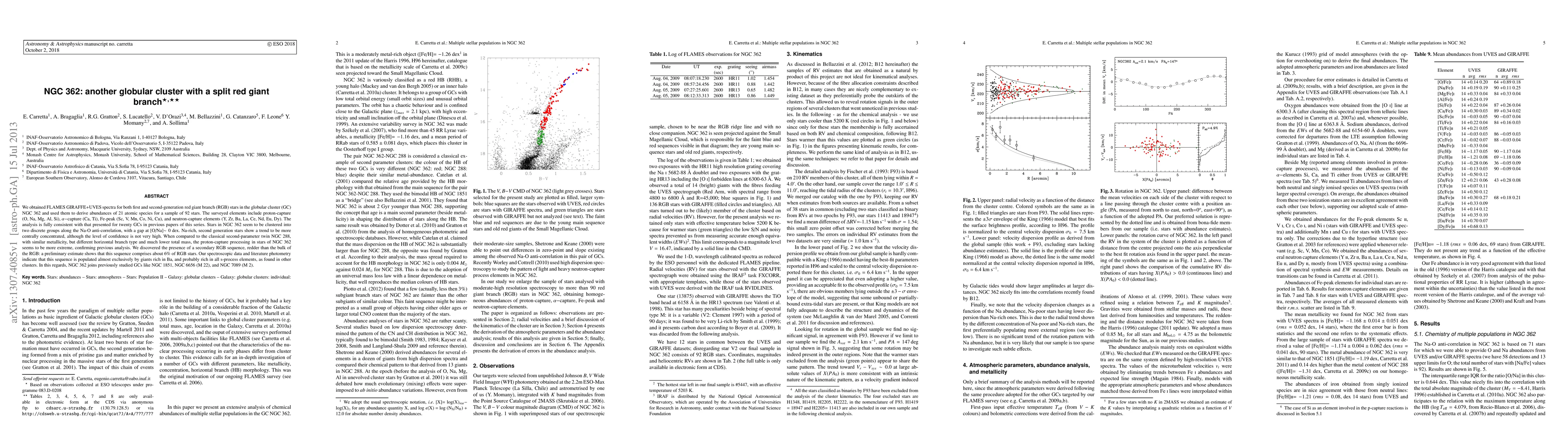 This study analyzes FLAMES spectra of NGC 362's red giant branch stars, revealing two distinct abundance groups with a notable Na-O anti-correlation and a secondary RGB sequence comprising about 6% of stars. This sequence is rich in s-process elements, similar to other clusters.