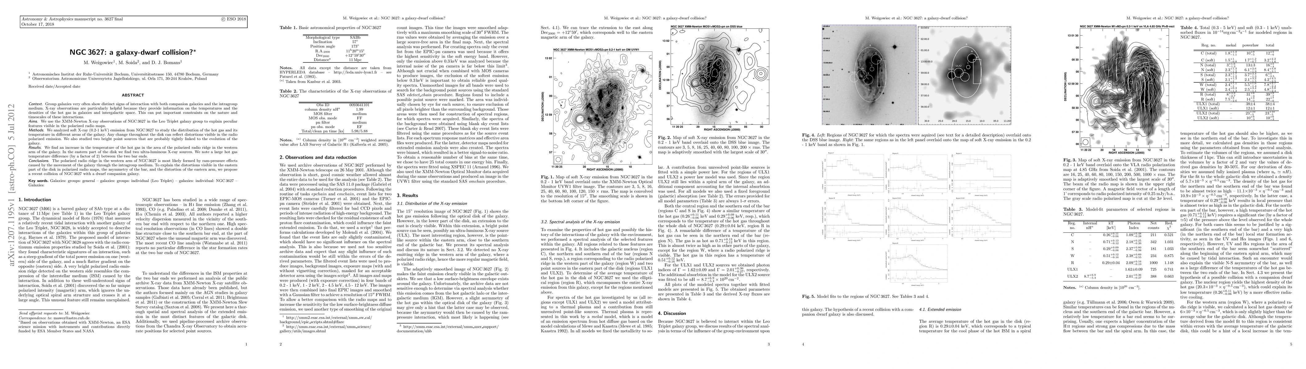 This study uses XMM-Newton X-ray observations of NGC 3627 to investigate the galaxy's hot gas distribution and temperature, linking these findings to distortions in its polarized radio maps. The analysis suggests a recent collision with a dwarf galaxy, evidenced by temperature differences and ultra-luminous X-ray sources in the eastern part of the disk.