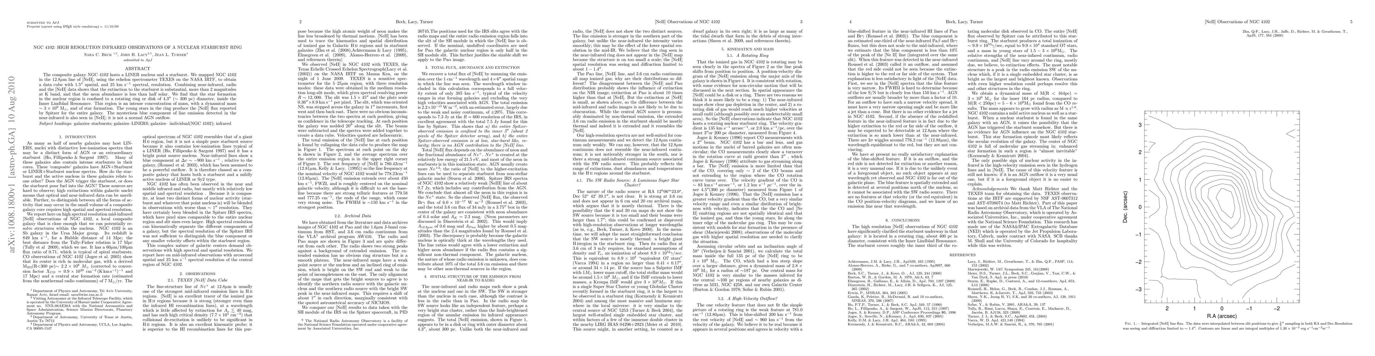 The composite galaxy NGC 4102 hosts a LINER nucleus and a starburst. We mapped NGC 4102 in the 12.8 micron line of [NeII], using the echelon spectrometer TEXES on the NASA IRTF, to obtain a data cube with 1.5" spatial and 25 km/s spectral, resolution. Combining near-infrared, radio, and the [NeII] data shows that the extinction to the starburst is substantial, more than 2 magnitudes at K band, and that the neon abundance is less than half solar. We find that the star formation in the nuclear region is confined to a rotating ring or disk of 4.3" (~300 pc) diameter, inside the Inner Lindblad Resonance. This region is an intense concentration of mass, with a dynamical mass of ~3 x 10^9 solar masses, and of star formation. The young stars in the ring produce the [NeII] flux reported by Spitzer for the entire galaxy. The mysterious blue component of line emission detected in the near-infrared is also seen in [NeII]; it is not a normal AGN outflow.