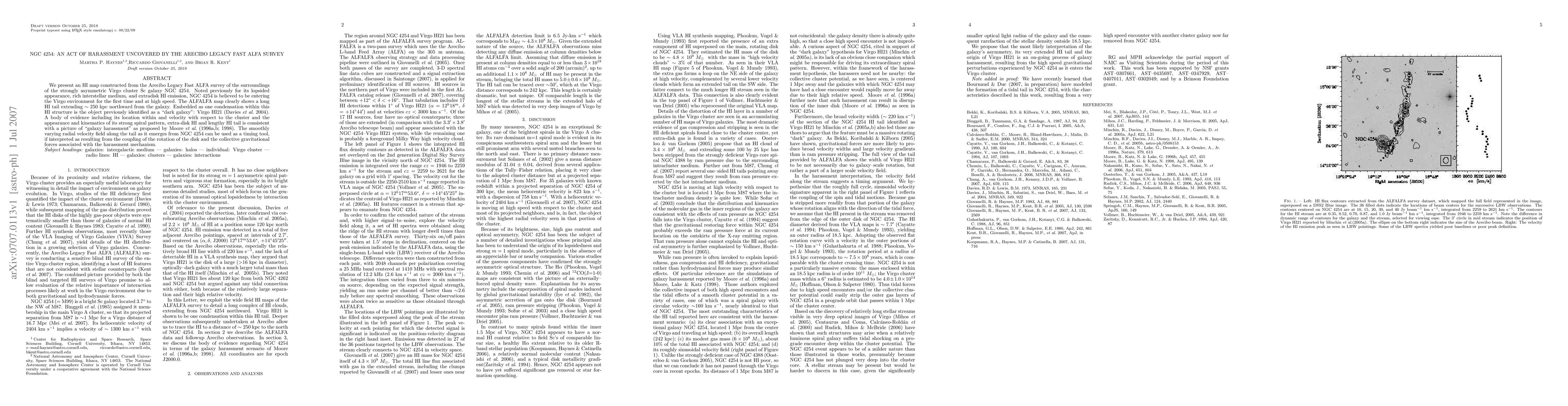 The Arecibo Legacy Fast ALFA survey reveals a long HI tail extending from NGC 4254, a Virgo cluster galaxy experiencing "galaxy harassment," which is consistent with its first high-speed entry into the cluster environment. The tail's radial velocity field suggests a timing mechanism linked to the gravitational forces of harassment.
