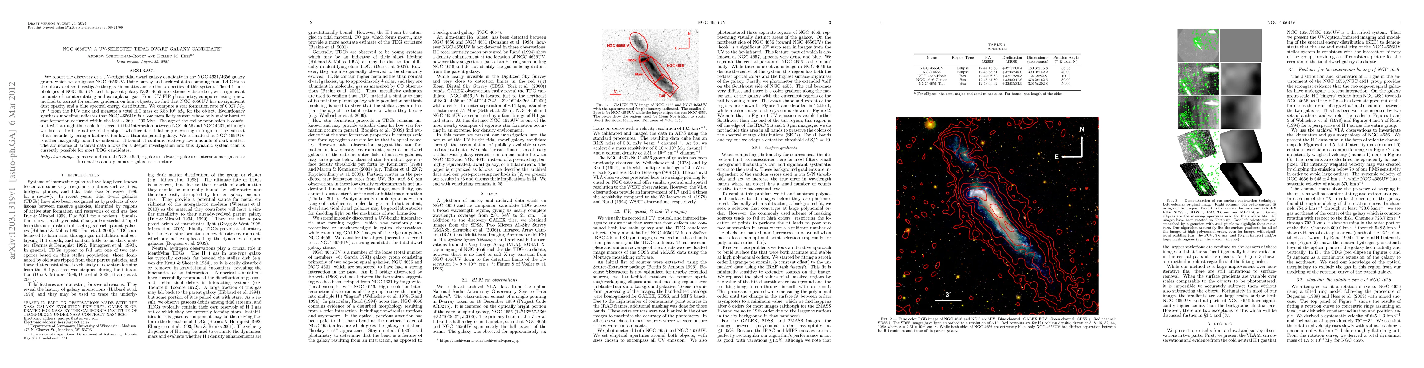 NGC 4656UV, a UV-bright tidal dwarf galaxy candidate in the NGC 4631/4656 group, exhibits disturbed HI morphologies and a blue spectral energy distribution with no significant dust opacity. Its recent star formation and low metallicity suggest a recent tidal interaction origin.