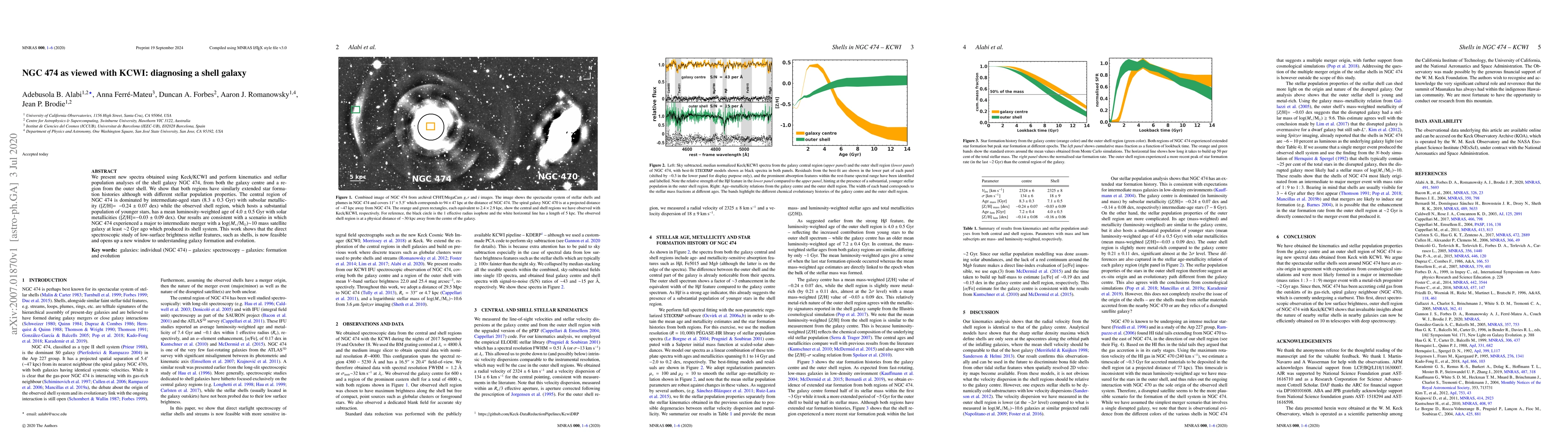 We present new spectra obtained using Keck/KCWI and perform kinematics and stellar population analyses of the shell galaxy NGC 474, from both the galaxy centre and a region from the outer shell. We show that both regions have similarly extended star formation histories although with different stellar population properties. The central region of NGC 474 is dominated by intermediate-aged stars (8.3 \pm 0.3 Gyr) with subsolar metallicity ([Z/H]= -0.24 \pm 0.07 dex) while the observed shell region, which hosts a substantial population of younger stars, has a mean luminosity-weighted age of 4.0 \pm 0.5 Gyr with solar metallicities ([Z/H]=-0.03 \pm 0.09 dex). Our results are consistent with a scenario in which NGC 474 experienced a major to intermediate merger with a log\((M_*/M_\odot)\sim10 \) mass satellite galaxy at least \sim 2 Gyr ago which produced its shell system. This work shows that the direct spectroscopic study of low-surface brightness stellar features, such as shells, is now feasible and opens up a new window to understanding galaxy formation and evolution.