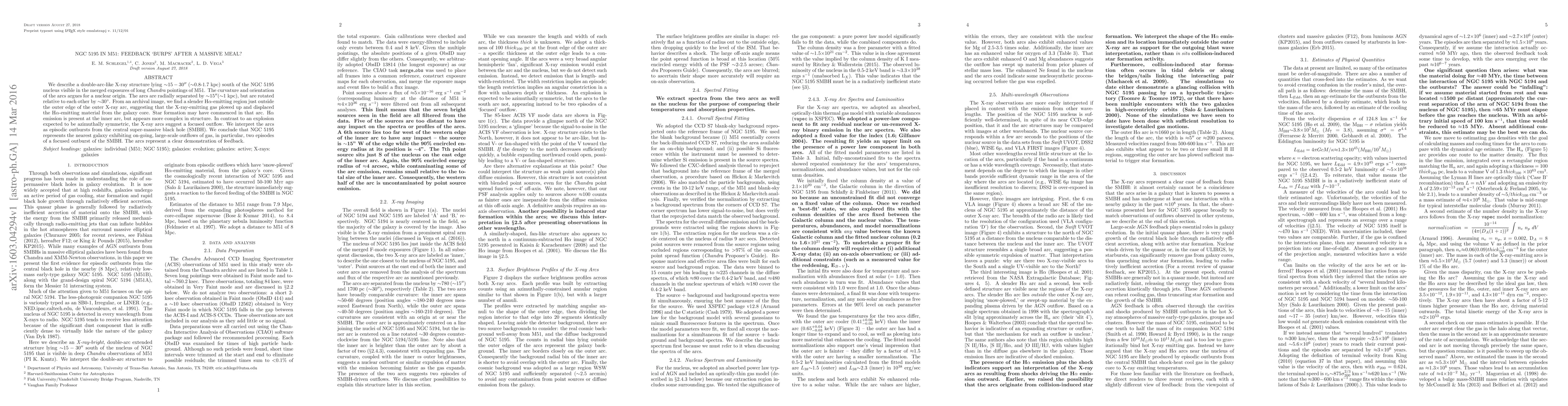 The paper identifies a double-arc-like X-ray structure in NGC 5195, suggesting episodic outbursts from its central supermassive black hole causing large-scale gas outflows. These arcs indicate focused outflows and feedback mechanisms following the galaxy's "massive meal."