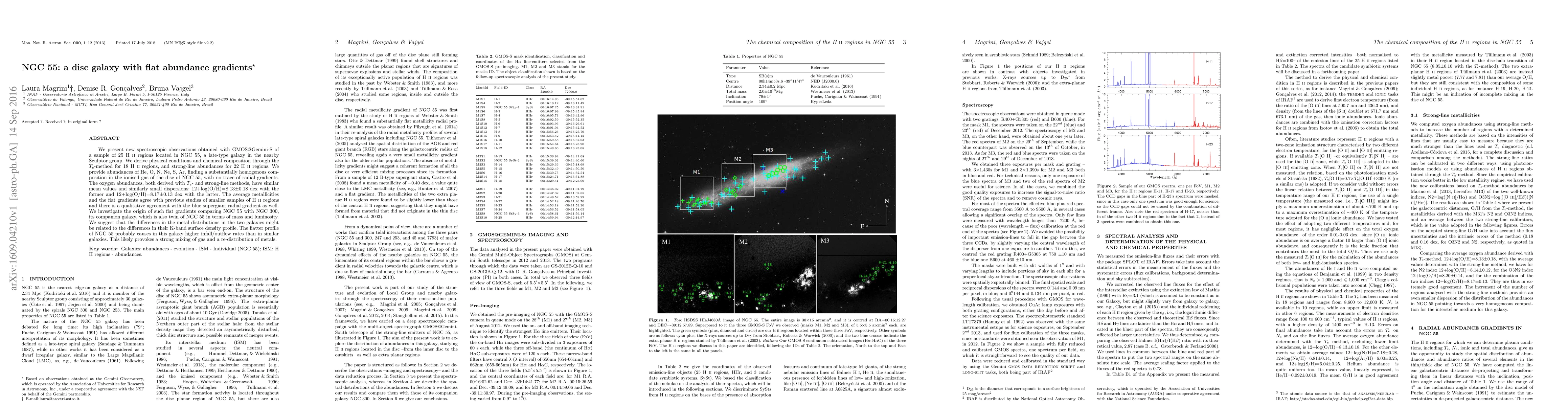 This study finds that the galaxy NGC 55 has a flat abundance gradient in its ionized gas, with similar oxygen abundances throughout the disc, unlike many other galaxies.