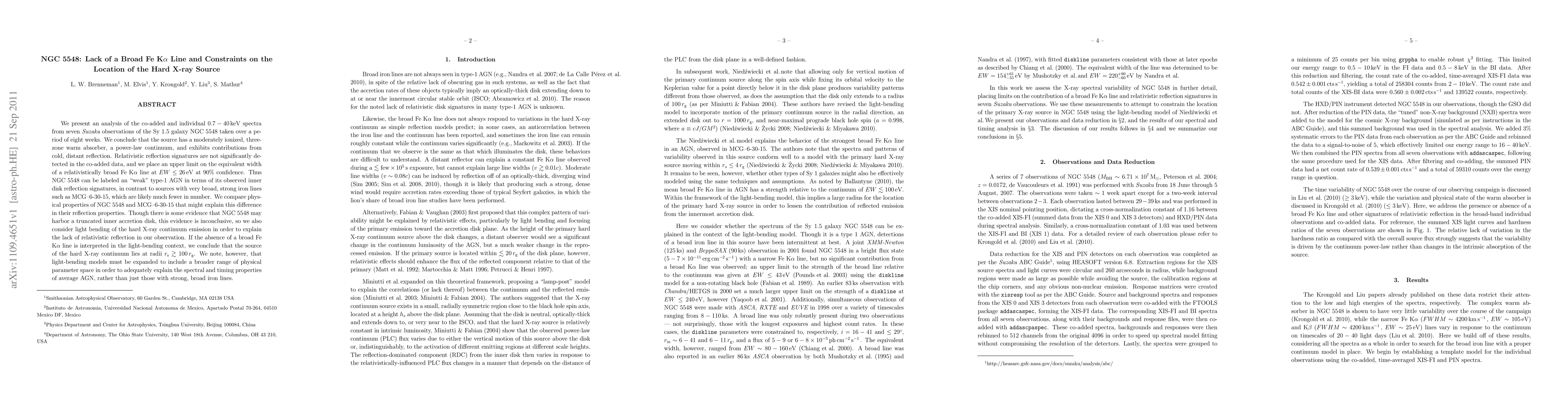 We present an analysis of the co-added and individual 0.7-40 keV spectra from seven Suzaku observations of the Sy 1.5 galaxy NGC 5548 taken over a period of eight weeks. We conclude that the source has a moderately ionized, three-zone warm absorber, a power-law continuum, and exhibits contributions from cold, distant reflection. Relativistic reflection signatures are not significantly detected in the co-added data, and we place an upper limit on the equivalent width of a relativistically broad Fe K line at EW \leq 26 eV at 90% confidence. Thus NGC 5548 can be labeled an "weak" type-1 AGN in terms of its observed inner disk reflection signatures, in contrast to sources with very broad, strong iron lines such as MCG-6-30-15, which are likely much fewer in number. We compare physical properties of NGC 5548 and MCG-6-30-15 that might explain this difference in their reflection properties. Though there is some evidence that NGC 5548 may harbor a truncated inner accretion disk, this evidence is inconclusive, so we also consider light bending of the hard X-ray continuum emission in order to explain the lack of relativistic reflection in our observation. If the absence of a broad Fe K line is interpreted in the light-bending context, we conclude that the source of the hard X-ray continuum lies at <100 gravitational radii. We note, however, that light-bending models must be expanded to include a broader range of physical parameter space in order to adequately explain the spectral and timing properties of average AGN, rather than just those with strong, broad iron lines.