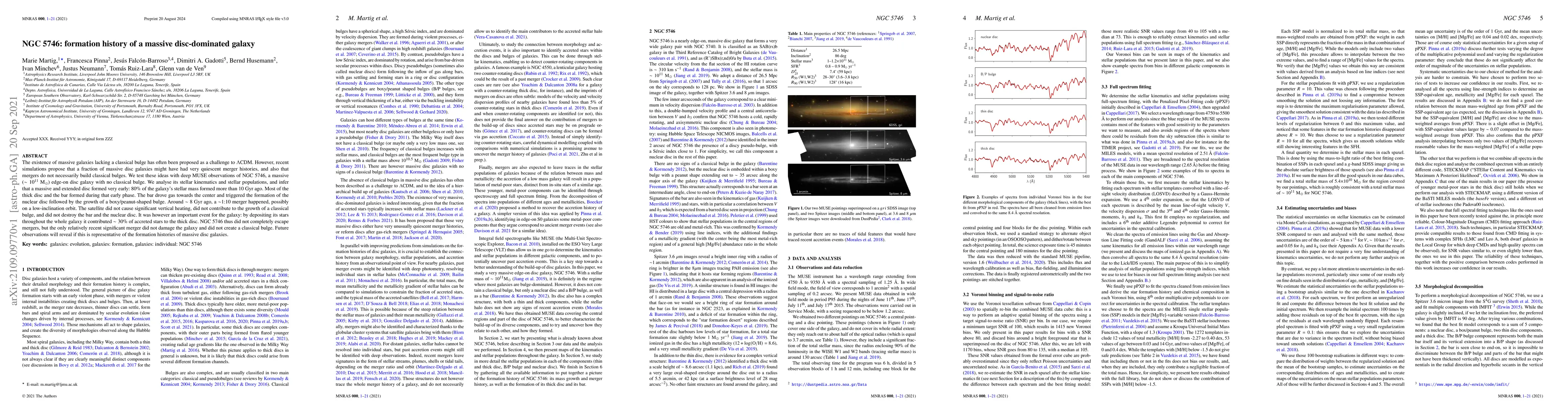 NGC 5746, a massive disc-dominated galaxy, formed its extended disc early, with 80% of its stellar mass created over 10 Gyr ago. A minor, low-inclination merger around 8 Gyr ago contributed significantly to the thick disc without forming a classical bulge or disrupting existing structures.