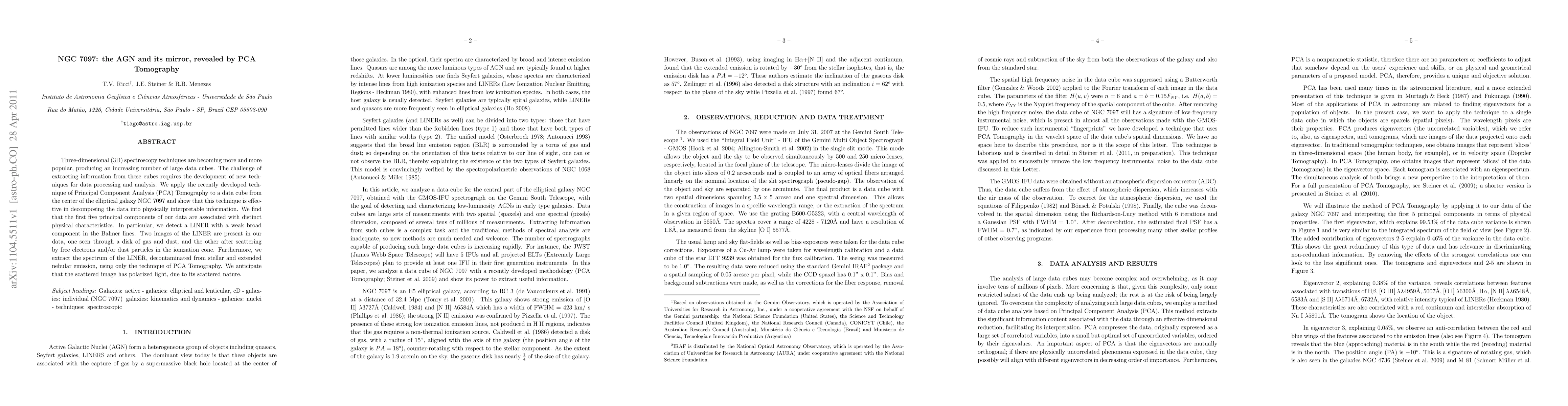Three-dimensional (3D) spectroscopy techniques are becoming more and more popular, producing an increasing number of large data cubes. The challenge of extracting information from these cubes requires the development of new techniques for data processing and analysis. We apply the recently developed technique of Principal Component Analysis (PCA) Tomography to a data cube from the center of the elliptical galaxy NGC 7097 and show that this technique is effective in decomposing the data into physically interpretable information. We find that the first five principal components of our data are associated with distinct physical characteristics. In particular, we detect a LINER with a weak broad component in the Balmer lines. Two images of the LINER are present in our data, one seen through a disk of gas and dust, and the other after scattering by free electrons and/or dust particles in the ionization cone. Furthermore, we extract the spectrum of the LINER, decontaminated from stellar and extended nebular emission, using only the technique of PCA Tomography. We anticipate that the scattered image has polarized light, due to its scattered nature.