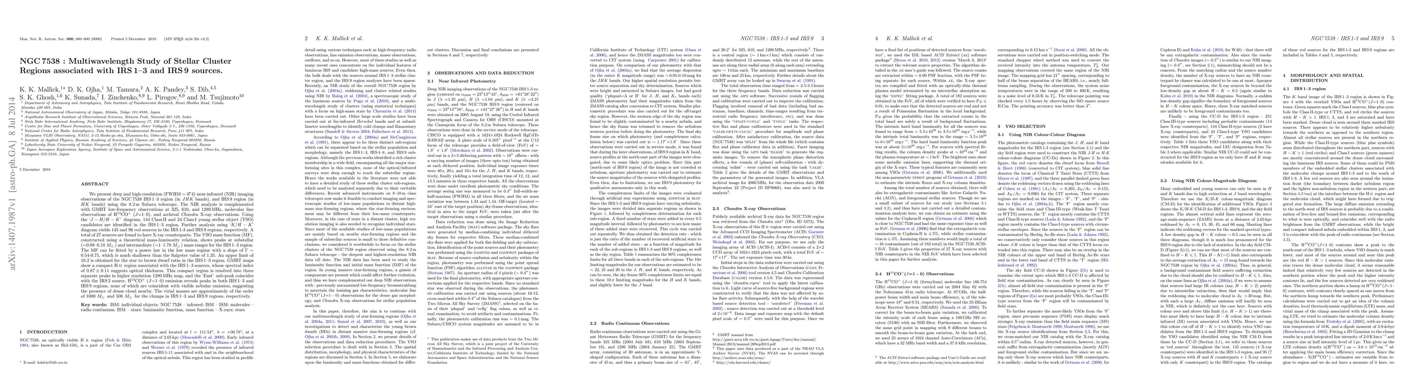 We present deep and high-resolution (FWHM ~ 0.4 arcsec) near-infrared (NIR) imaging observations of the NGC 7538 IRS 1-3 region (in JHK bands), and IRS 9 region (in HK bands) using the 8.2m Subaru telescope. The NIR analysis is complemented with GMRT low-frequency observations at 325, 610, and 1280 MHz, molecular line observations of H13CO+ (J=1-0), and archival Chandra X-ray observations. Using the 'J-H/H-K' diagram, 144 Class II and 24 Class I young stellar object (YSO) candidates are identified in the IRS 1-3 region. Further analysis using 'K/H-K' diagram yields 145 and 96 red sources in the IRS 1-3 and IRS 9 regions, respectively. A total of 27 sources are found to have X-ray counterparts. The YSO mass function (MF), constructed using a theoretical mass-luminosity relation, shows peaks at substellar (~0.08-0.18 Msolar) and intermediate (~1-1.78 Msolar) mass ranges for the IRS 1-3 region. The MF can be fitted by a power law in the low mass regime with a slope of Gamma ~ 0.54-0.75, which is much shallower than the Salpeter value of 1.35. An upper limit of 10.2 is obtained for the star to brown dwarf ratio in the IRS 1-3 region. GMRT maps show a compact HII region associated with the IRS 1-3 sources, whose spectral index of 0.87+-0.11 suggests optical thickness. This compact region is resolved into three separate peaks in higher resolution 1280 MHz map, and the 'East' sub-peak coincides with the IRS 2 source. H13CO+ (J=1-0) emission reveals peaks in both IRS 1-3 and IRS 9 regions, none of which are coincident with visible nebular emission, suggesting the presence of dense cloud nearby. The virial masses are approximately of the order of 1000 Msolar and 500 Msolar for the clumps in IRS 1-3 and IRS 9 regions, respectively.