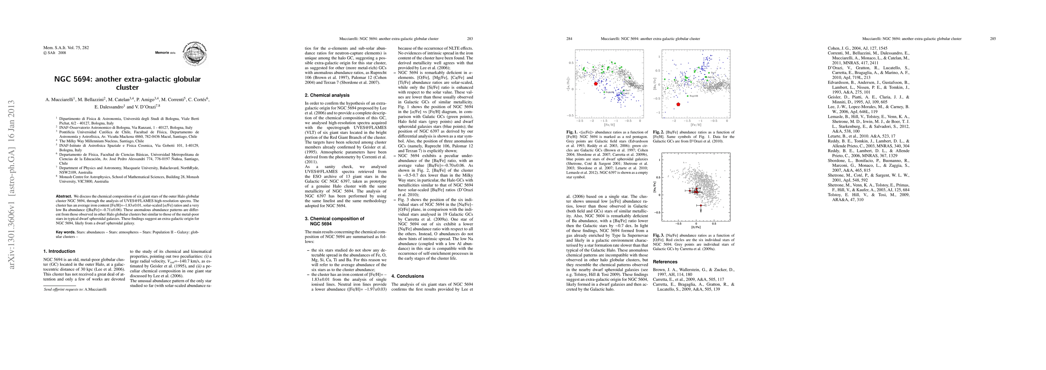 Summary: The study of NGC5694's six giant stars reveals an average iron content and solar-scaled alpha-to-iron ratios, but an unusually low barium abundance, suggesting an extra-galactic origin likely from a dwarf spheroidal galaxy, unlike typical Halo globular clusters.