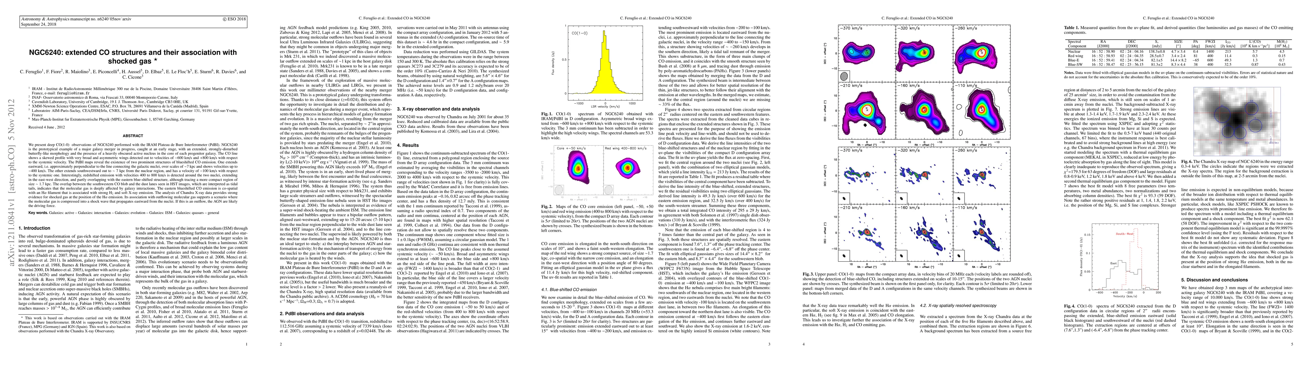 We present deep CO observations of NGC6240 performed with the IRAM Plateau de Bure Interferometer (PdBI). NGC6240 is the prototypical example of a major galaxy merger in progress, caught at an early stage, with an extended, strongly-disturbed butterfly-like morphology and the presence of a heavily obscured active nucleus in the core of each progenitor galaxy. The CO line shows a skewed profile with very broad and asymmetric wings detected out to velocities of -600 km/s and +800 km/s with respect to the systemic velocity. The PdBI maps reveal the existence of two prominent structures of blueshifted CO emission. One extends eastward, i.e. approximately perpendicular to the line connecting the galactic nuclei, over scales of ~7 kpc and shows velocities up to -400 km/s. The other extends southwestward out to ~7 kpc from the nuclear region, and has a velocity of -100 km/s with respect to the systemic one. Interestingly, redshifted emission with velocities 400 to 800 km/s is detected around the two nuclei, extending in the east-west direction, and partly overlapping with the eastern blue-shifted structure, although tracing a more compact region of size ~1.7 kpc. The overlap between the southwestern CO blob and the dust lanes seen in HST images, which are interpreted as tidal tails, indicates that the molecular gas is deeply affected by galaxy interactions. The eastern blueshifted CO emission is co-spatial with an Halpha filament that is associated with strong H2 and soft X-ray emission. The analysis of Chandra X-ray data provides strong evidence for shocked gas at the position of the Halpha emission. Its association with outflowing molecular gas supports a scenario where the molecular gas is compressed into a shock wave that propagates eastward from the nuclei. If this is an outflow, the AGN are likely the driving force.
