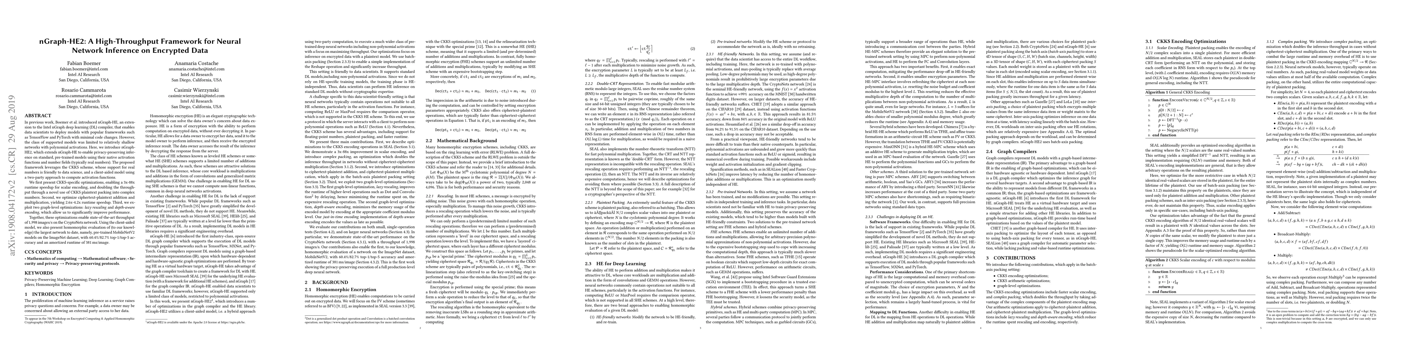 Researchers developed nGraph-HE2 to enable fast and secure neural network inference on encrypted data using pre-trained models with native activation functions. The framework achieved state-of-the-art throughput of 1,998 images/s on the CryptoNets network.