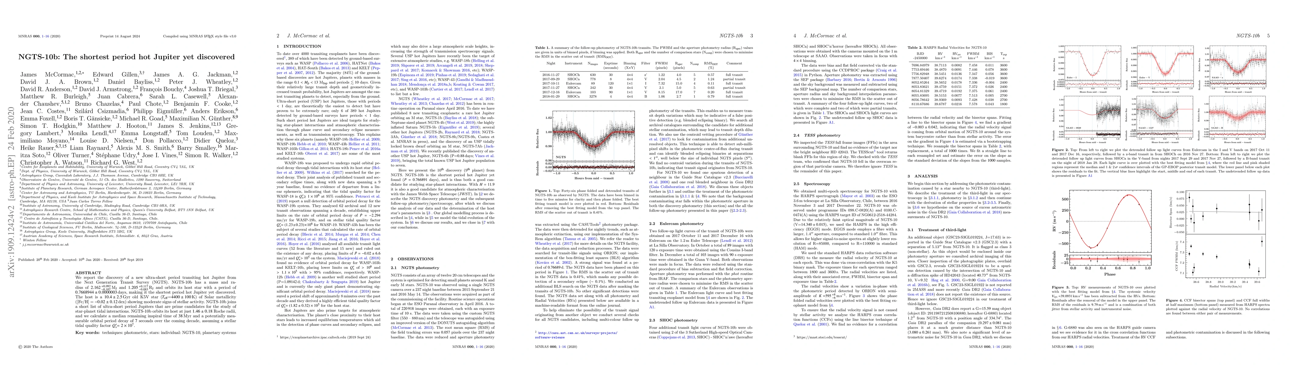 NGTS-10b, discovered by the Next Generation Transit Survey, is an ultra-short period hot Jupiter with a period of 0.767 days, making it the shortest period hot Jupiter known. It orbits a K5V star and is a prime candidate for studying star-planet tidal interactions.