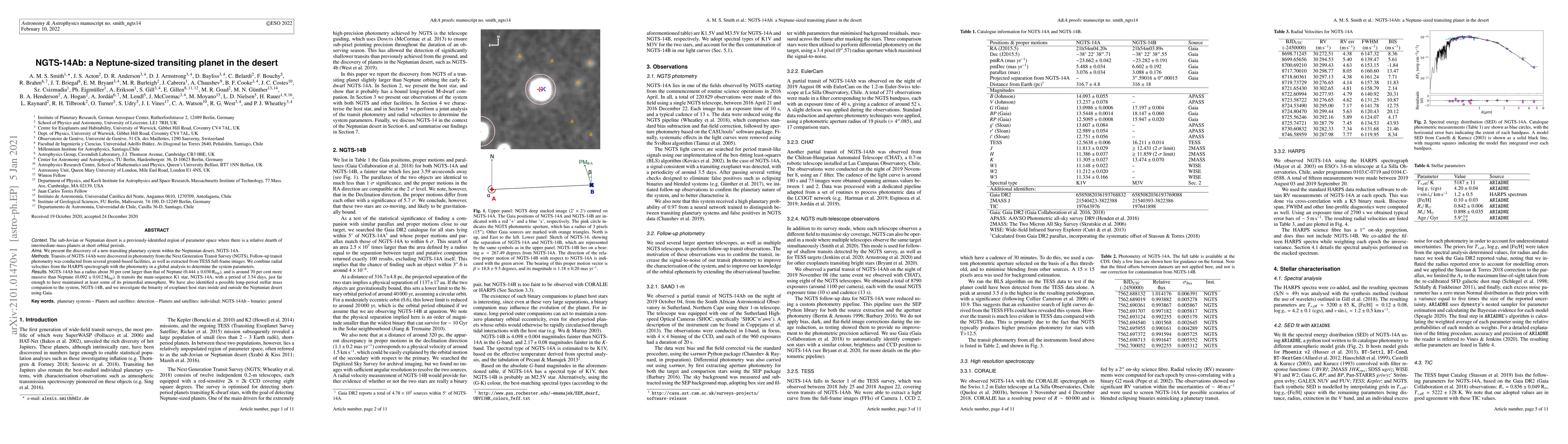 NGTS-14Ab is a newly discovered Neptune-sized transiting planet found in the Neptunian desert, characterized by a radius 30% larger than Neptune and a mass 70% greater. It orbits a K1 star every 3.54 days, suggesting it retains some primordial atmosphere.