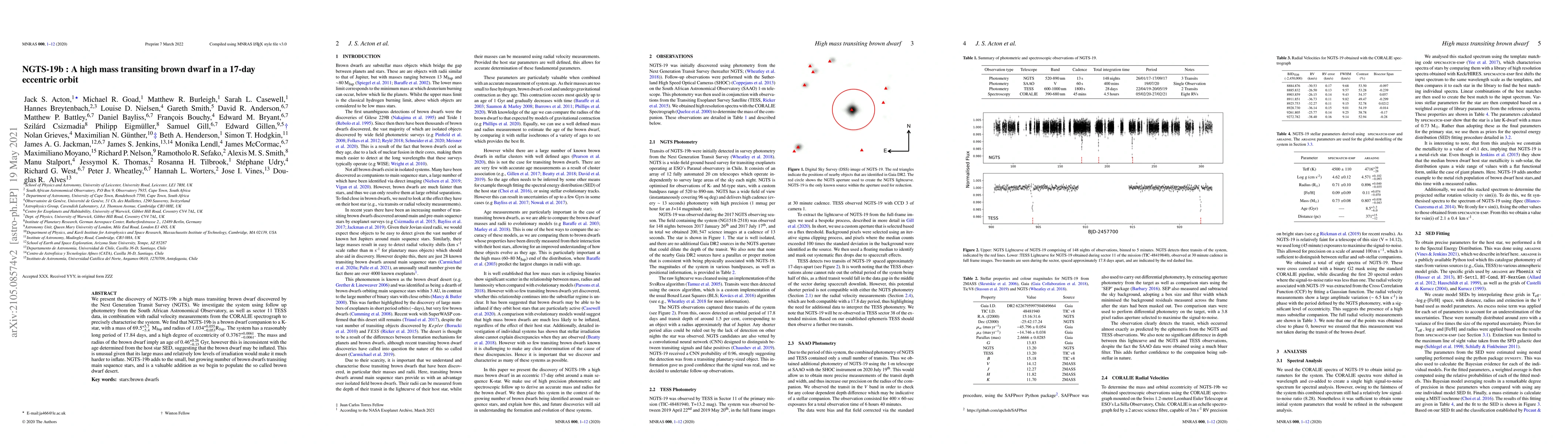 NGTS-19b is a high mass transiting brown dwarf with a mass of 69.5 M_Jup and a radius of 1.034 R_Jup, discovered in a 17.84-day eccentric orbit around a K-star. Its inflated size suggests an age inconsistency, indicating unusual atmospheric properties.