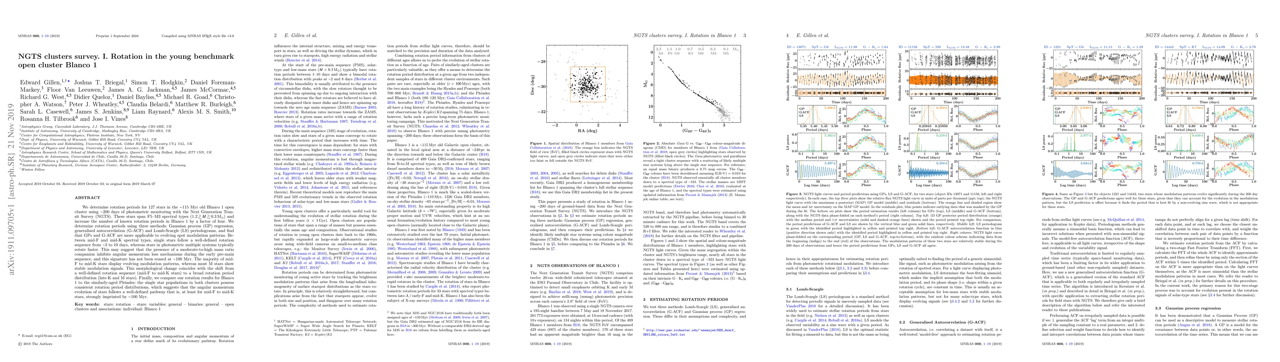 The NGTS survey determined rotation periods for 127 stars in the Blanco 1 open cluster, revealing a well-defined rotation sequence for mid-F to mid-K stars and faster rotation in photometric multiple systems, suggesting angular momentum loss inhibition by companions. Comparisons with the Pleiades indicate consistent rotation periods for single stars, implying a well-defined angular momentum evolution pathway.