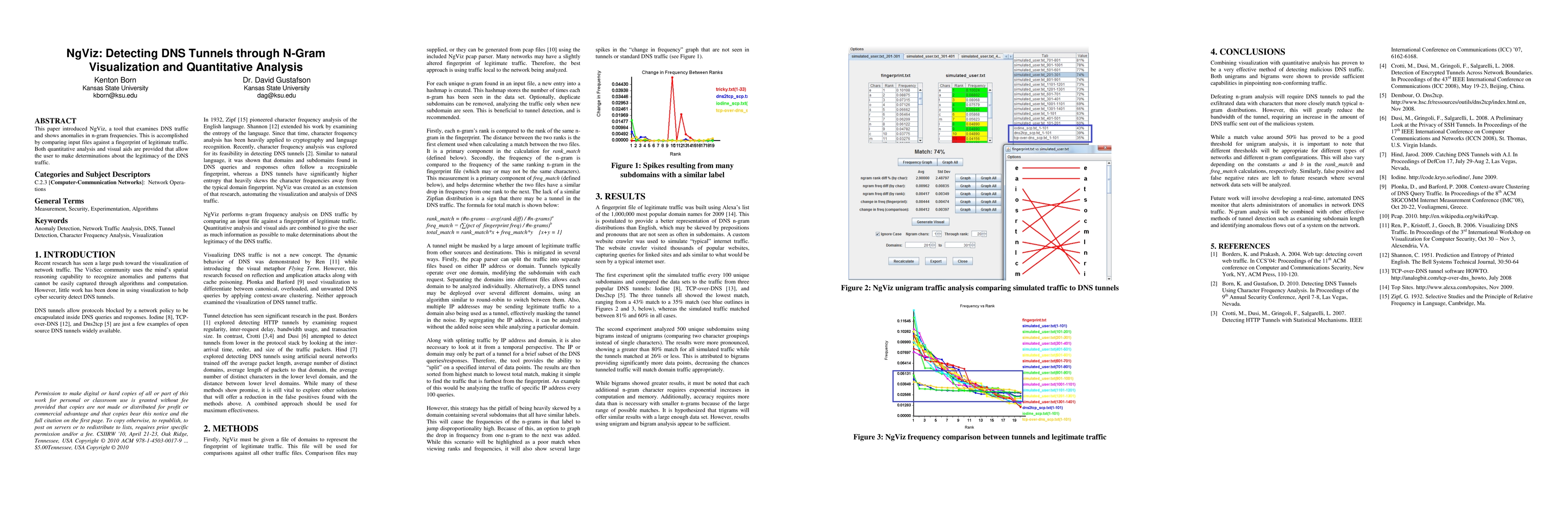 Summary: NgViz is a tool for detecting DNS tunnel anomalies by analyzing n-gram frequencies in DNS traffic. It combines quantitative analysis with visual aids to help users determine the legitimacy of DNS traffic by comparing it against a baseline of normal traffic patterns.
