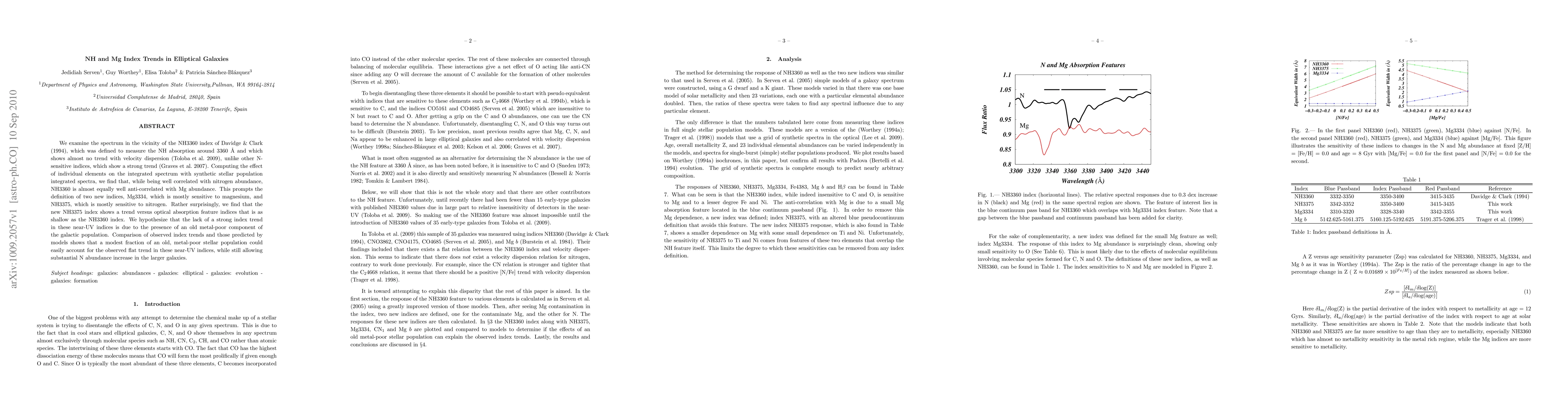 We examine the spectrum in the vicinity of the NH3360 index of Davidge & Clark (1994), which was defined to measure the NH absorption around 3360 \AA and which shows almost no trend with velocity dispersion (Toloba et al. 2009), unlike other N- sensitive indices, which show a strong trend (Graves et al. 2007). Computing the effect of individual elements on the integrated spectrum with synthetic stellar population integrated spectra, we find that, while being well correlated with nitrogen abundance, NH3360 is almost equally well anti-correlated with Mg abundance. This prompts the definition of two new indices, Mg3334, which is mostly sensitive to magnesium, and NH3375, which is mostly sensitive to nitrogen. Rather surprisingly, we find that the new NH3375 index shows a trend versus optical absorption feature indices that is as shallow as the NH3360 index. We hypothesize that the lack of a strong index trend in these near-UV indices is due to the presence of an old metal-poor component of the galactic population. Comparison of observed index trends and those predicted by models shows that a modest fraction of an old, metal-poor stellar population could easily account for the observed flat trend in these near-UV indices, while still allowing substantial N abundance increase in the larger galaxies.