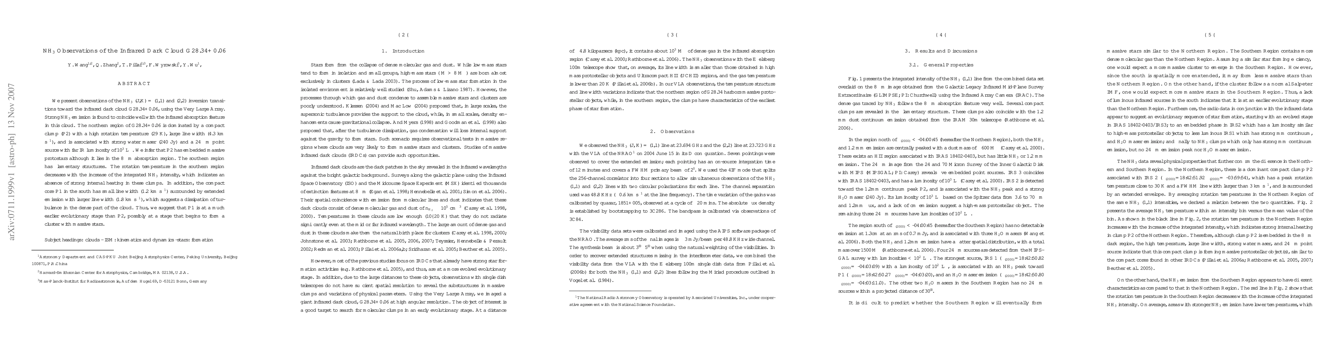 This study observes ammonia emission in the infrared dark cloud G28.34+0.06, revealing two distinct regions with different properties, one with embedded massive protostars and another with filamentary structures suggesting an earlier evolutionary stage.