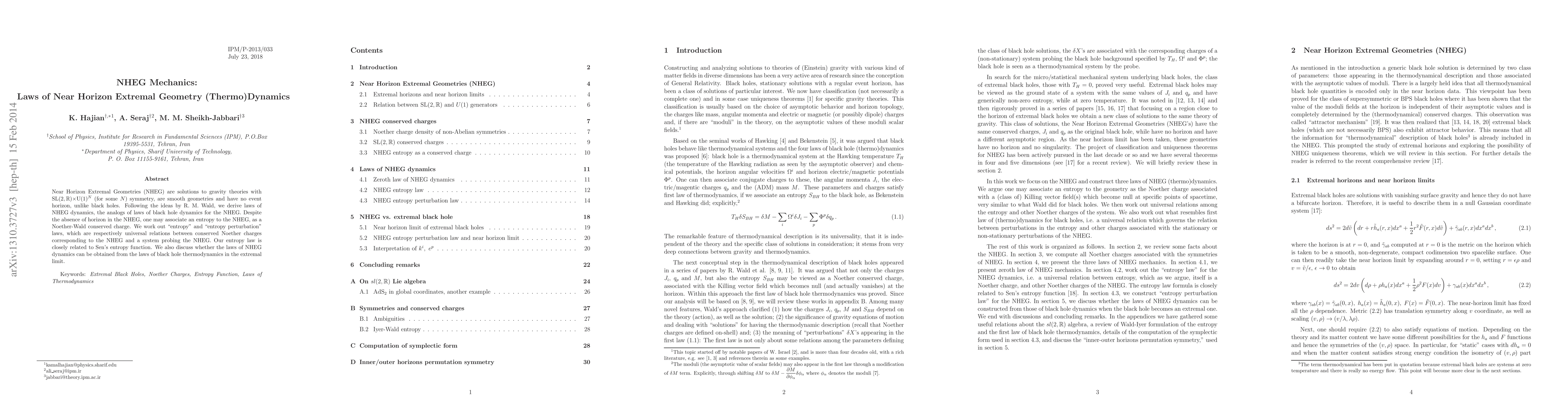 Near Horizon Extremal Geometries (NHEG) are solutions to gravity theories with $ SL(2,R) \times U(1)^N $ (for some N) symmetry, are smooth geometries and have no event horizon, unlike black holes. Following the ideas by R. M. Wald, we derive laws of NHEG dynamics, the analogs of laws of black hole dynamics for the NHEG. Despite the absence of horizon in the NHEG, one may associate an entropy to the NHEG, as a Noether-Wald conserved charge. We work out entropy and entropy perturbation laws, which are respectively universal relations between conserved Noether charges corresponding to the NHEG and a system probing the NHEG. Our entropy law is closely related to Sen's entropy function. We also discuss whether the laws of NHEG dynamics can be obtained from the laws of black hole thermodynamics in the extremal limit.