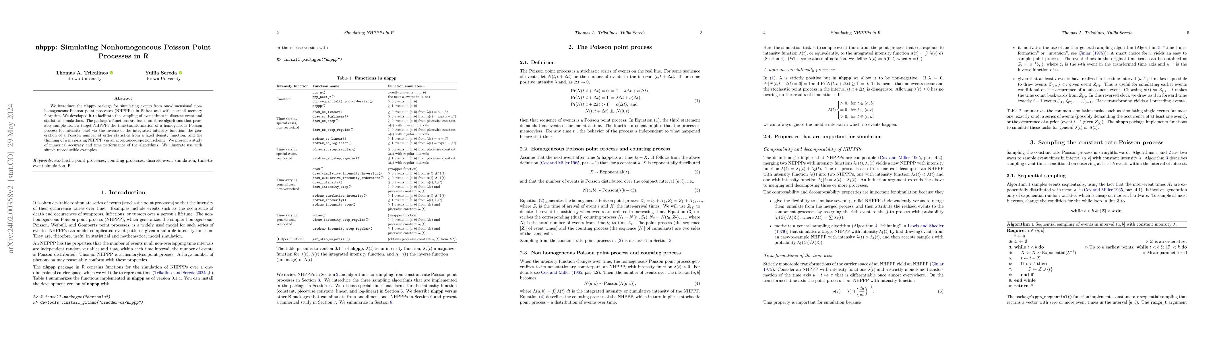 The `nhppp` R package efficiently simulates one-dimensional non-homogeneous Poisson point processes (NHPPPs) using three algorithms, enabling accurate and memory-efficient event time sampling for discrete event and statistical simulations. The package performance and accuracy are numerically studied, with examples provided for user guidance.