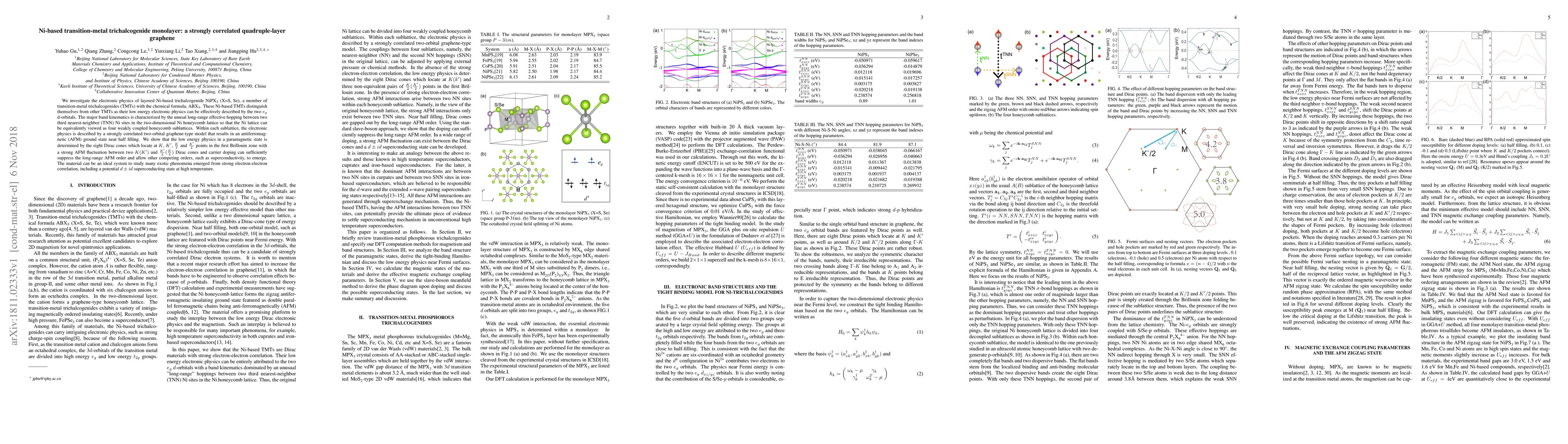 We investigate the electronic physics of layered Ni-based trichalcogenide NiPX$_3$ (X=S, Se), a member of transition-metal trichalcogenides (TMTs) with the chemical formula, ABX$_3$. These Ni-based TMTs distinguish themselves from other TMTs as their low energy electronic physics can be effectively described by the two $e_g$ d-orbitals. The major band kinematics is characterized by the unusal long-range effective hopping between two third nearest-neighbor (TNN) Ni sites in the two-dimensional Ni honeycomb lattice so that the Ni lattice can be equivalently viewed as four weakly coupled honeycomb sublattices. Within each sublattice, the electronic physics is described by a strongly correlated two-orbital graphene-type model that results in an antiferromagnetic (AFM) ground state near half filling. We show that the low energy physics in a paramagnetic state is determined by the eight Dirac cones which locate at $K$, $K'$, $\frac{K}{2}$ and $\frac{K'}{2}$ points in the first Brillouin zone with a strong AFM fluctuation between two $K (K')$ and $\frac{K'}{2} (\frac{K}{2})$ Dirac cones and carrier doping can sufficiently suppress the long-range AFM order and allow other competing orders, such as superconductivity, to emerge. The material can be an ideal system to study many exotic phenomena emerged from strong electron-electron correlation, including a potential $d\pm id$ superconducting state at high temperature.