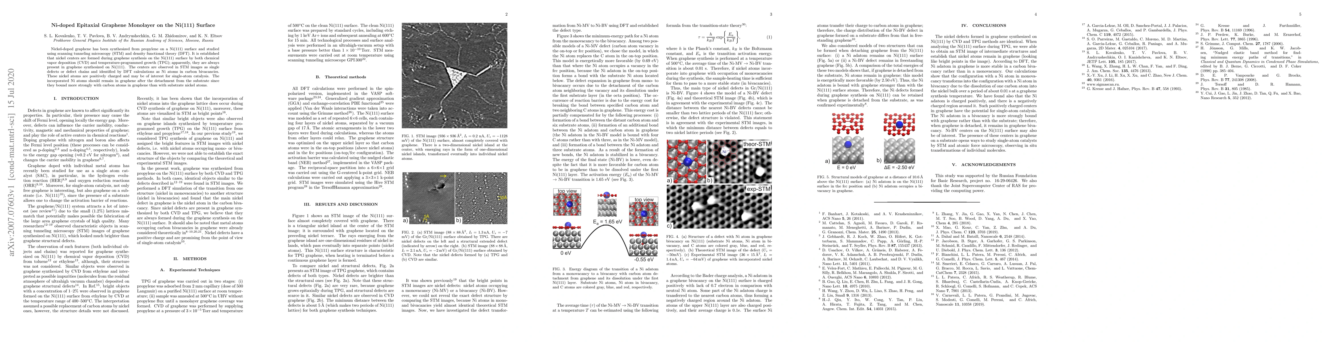 This paper synthesizes nickel-doped graphene on a Ni(111) surface using CVD and TPG, showing that nickel atoms form in carbon bivacancies as positively charged defects, potentially useful for catalysis, with strong binding to graphene.