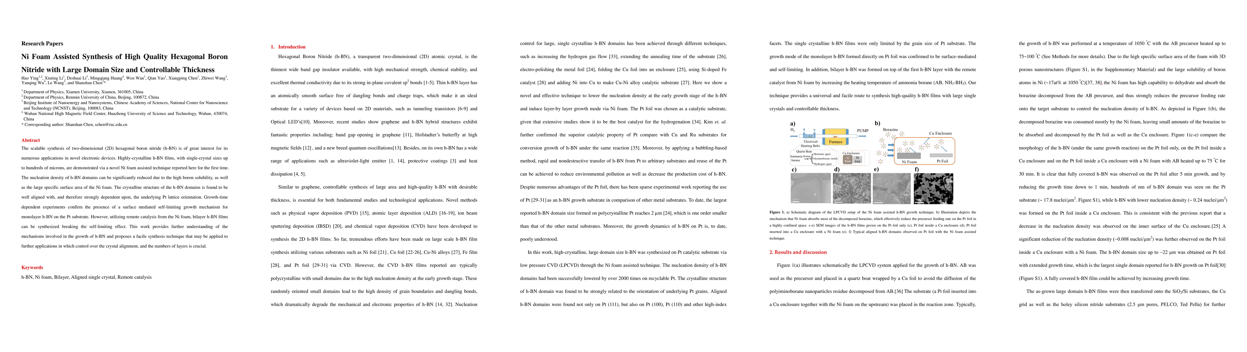 The paper reports a novel Ni foam assisted technique for scalable synthesis of highly-crystalline, large-domain hexagonal boron nitride (h-BN) films with controllable thickness, utilizing remote catalysis to break self-limiting growth mechanisms and offering potential for advanced electronic device applications.