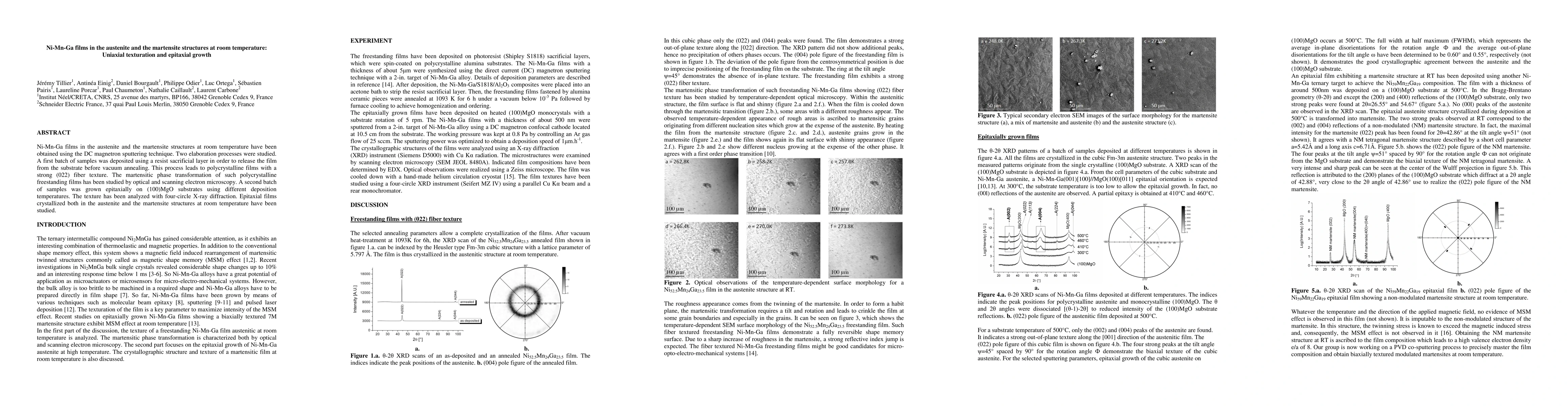 This paper investigates Ni-Mn-Ga films prepared via DC magnetron sputtering, focusing on their austenite and martensite structures at room temperature. The study includes two processes: one using a sacrificial layer for polycrystalline films with strong (022) texture, and another for epitaxial growth on MgO substrates, revealing both austenitic and martensitic structures at room temperature.
