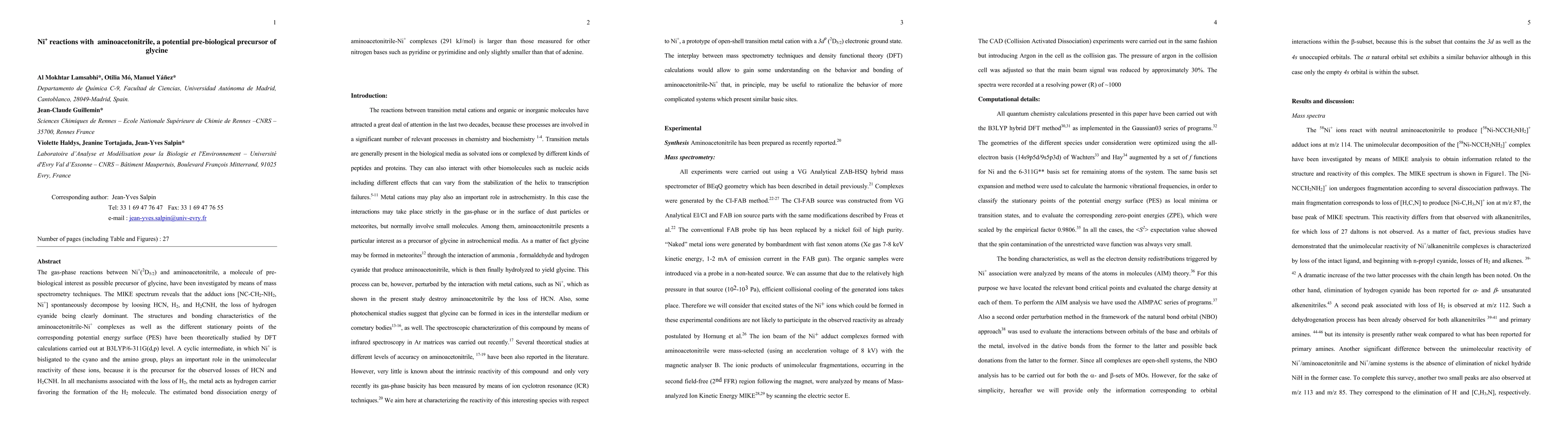 The gas-phase reactions between Ni+ (2D5/2) and aminoacetonitrile, a molecule of prebiological interest as possible precursor of glycine, have been investigated by means of mass spectrometry techniques. The mass-analyzed ion kinetic energy (MIKE) spectrum reveals that the adduct ions [NCCH2NH2, Ni+] spontaneously decompose by loosing HCN, H2, and H2CNH, the loss of hydrogen cyanide being clearly dominant. The structures and bonding characteristics of the aminoacetonitrile-Ni+ complexes as well as the different stationary points of the corresponding potential energy surface (PES) have been theoretically studied by density functional theory (DFT) calculations carried out at B3LYP/6-311G(d,p) level. A cyclic intermediate, in which Ni+ is bisligated to the cyano and the amino group, plays an important role in the unimolecular reactivity of these ions, because it is the precursor for the observed losses of HCN and H2CNH. In all mechanisms associated with the loss of H2, the metal acts as hydrogen carrier favoring the formation of the H2 molecule. The estimated bond dissociation energy of aminoacetonitrile-Ni+ complexes (291 kJ mol-1) is larger than those measured for other nitrogen bases such as pyridine or pyrimidine and only slightly smaller than that of adenine.