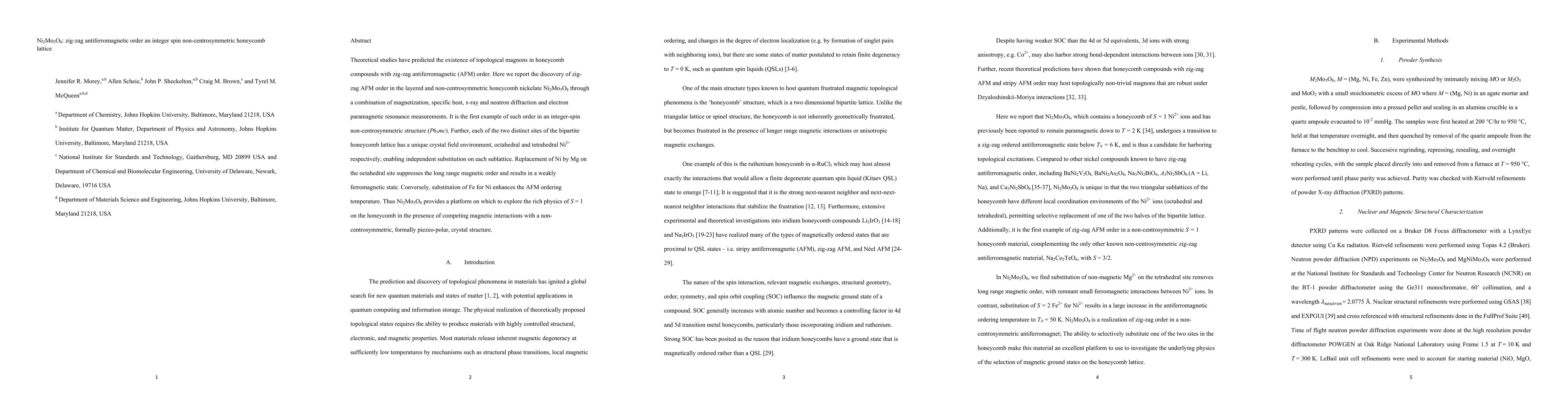 This paper reports the discovery of zig-zag antiferromagnetic order in the layered compound Ni$_2$Mo$_3$O$_8$, a non-centrosymmetric honeycomb lattice, using various experimental techniques. The study highlights the unique crystal field environments of its two distinct Ni sites and the effects of substituting Mg and Fe on its magnetic properties.