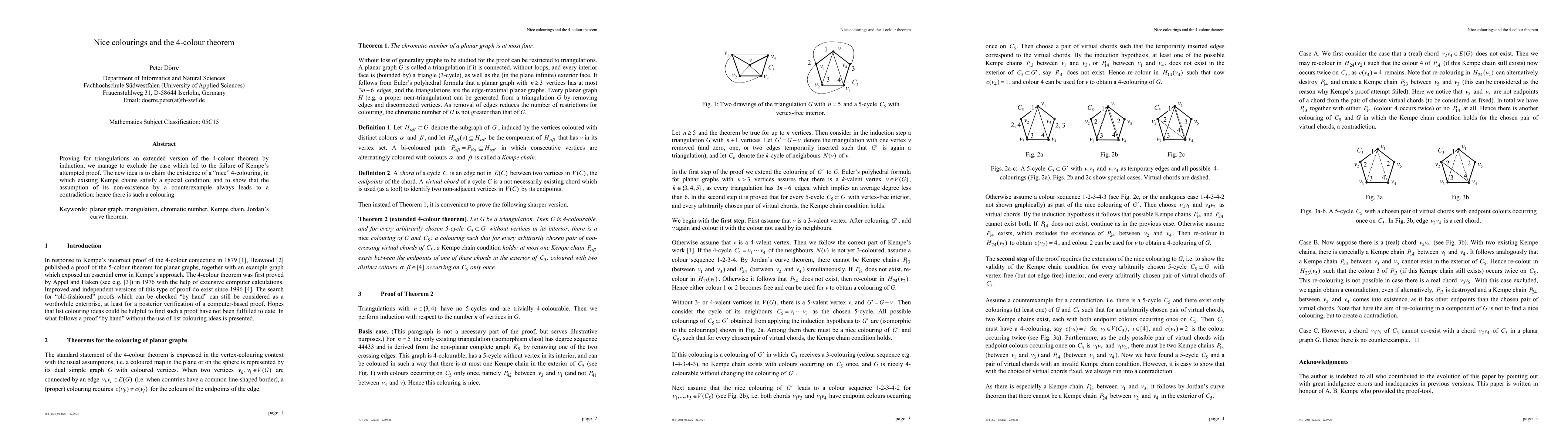 The paper proves an extended version of the 4-colour theorem for triangulations using induction, focusing on finding a specific type of colouring that satisfies certain conditions, rather than eliminating impossible cases.