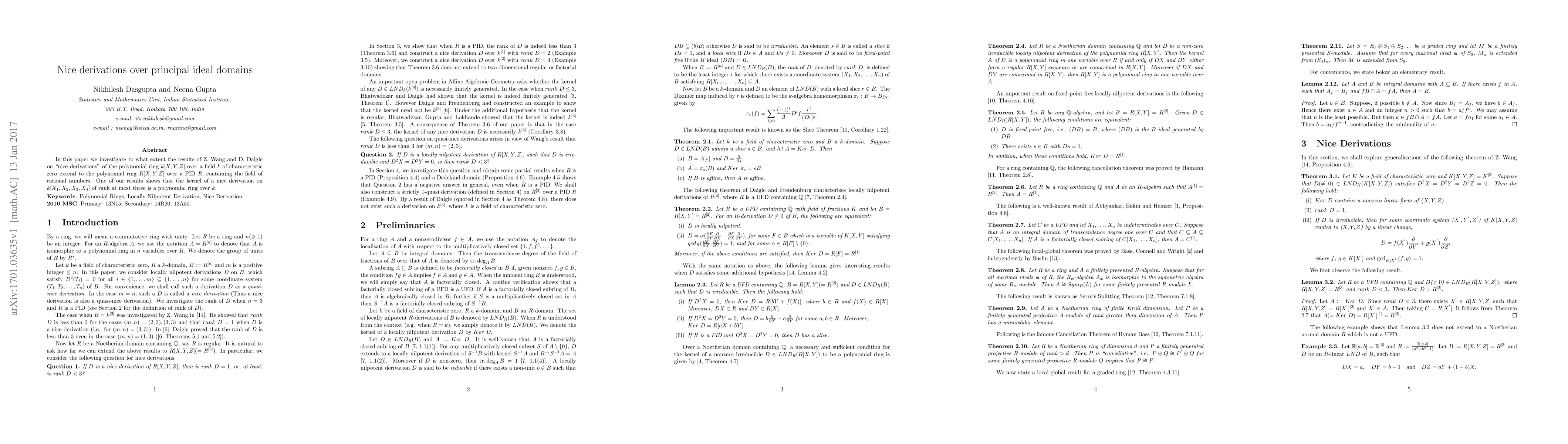 In this paper we investigate to what extent the results of Z. Wang and D. Daigle on nice derivations of the polynomial ring in three variables over a field k of characteristic zero extend to the polynomial ring over a PID R, containing the field of rational numbers. One of our results shows that the kernel of a nice derivation on the polynomial ring in four variables over k of rank at most three is a polynomial ring over k.