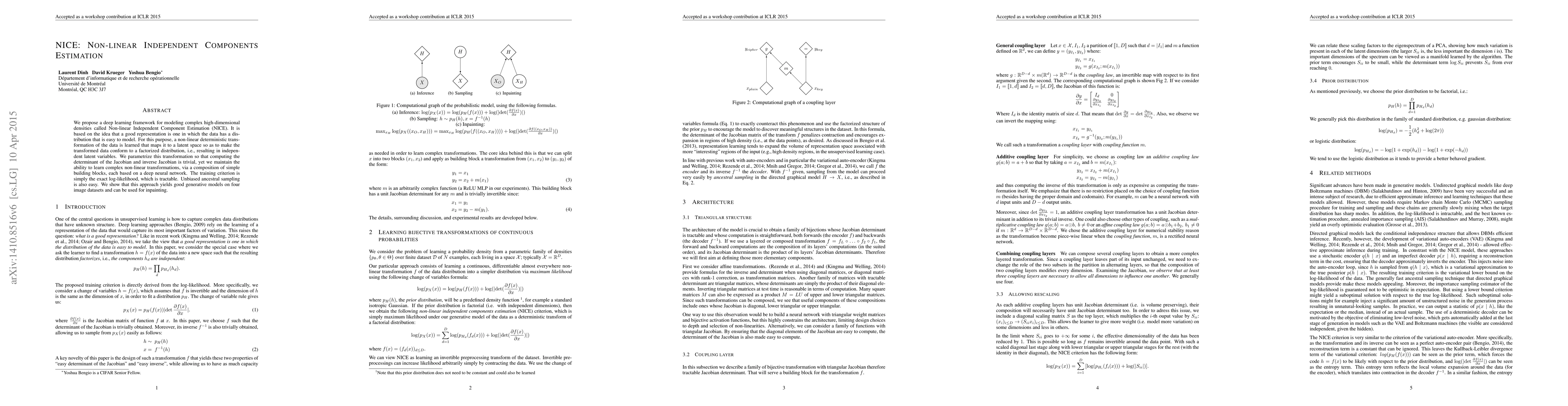 We propose a deep learning framework for modeling complex high-dimensional densities called Non-linear Independent Component Estimation (NICE). It is based on the idea that a good representation is one in which the data has a distribution that is easy to model. For this purpose, a non-linear deterministic transformation of the data is learned that maps it to a latent space so as to make the transformed data conform to a factorized distribution, i.e., resulting in independent latent variables. We parametrize this transformation so that computing the Jacobian determinant and inverse transform is trivial, yet we maintain the ability to learn complex non-linear transformations, via a composition of simple building blocks, each based on a deep neural network. The training criterion is simply the exact log-likelihood, which is tractable. Unbiased ancestral sampling is also easy. We show that this approach yields good generative models on four image datasets and can be used for inpainting.