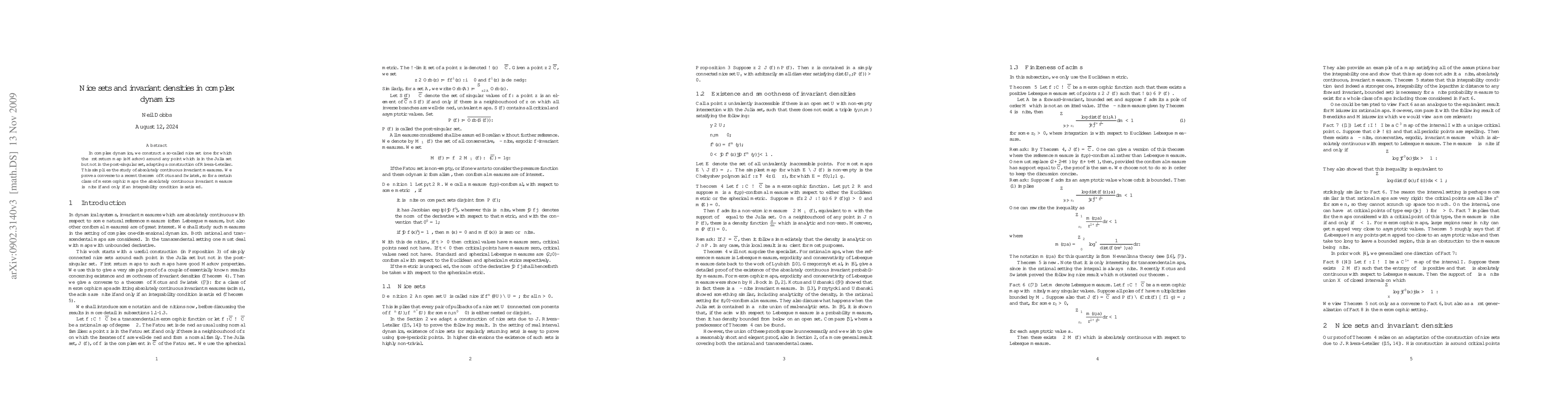 In complex dynamics, we construct a so-called nice set (one for which the first return map is Markov) around any point which is in the Julia set but not in the post-singular set, adapting a construction of Juan Rivera-Letelier. This simplifies the study of absolutely continuous invariant measures. We prove a converse to a recent theorem of Kotus and Swiatek, so for a certain class of meromorphic maps the absolutely continuous invariant measure is finite if and only if an integrability condition is satisfied.
