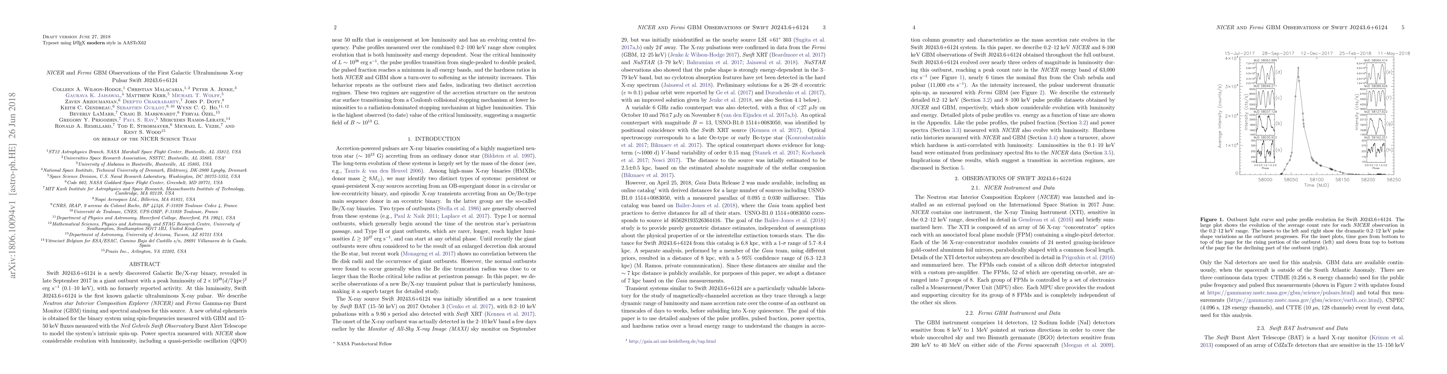 Swift J0243.6+6124 is a newly discovered Galactic Be/X-ray binary, revealed in late September 2017 in a giant outburst with a peak luminosity of 2E+39 (d/7 kpc)^2 erg/s (0.1-10 keV), with no formerly reported activity. At this luminosity, Swift J0243.6+6124 is the first known galactic ultraluminous X-ray pulsar. We describe Neutron star Interior Composition Explorer (NICER)} and Fermi Gamma-ray Burst Monitor (GBM) timing and spectral analyses for this source. A new orbital ephemeris is obtained for the binary system using spin-frequencies measured with GBM and 15-50 keV fluxes measured with the Neil Gehrels Swift Observatory Burst Alert Telescope to model the system's intrinsic spin-up. Power spectra measured with NICER show considerable evolution with luminosity, including a quasi-periodic oscillation (QPO) near 50 mHz that is omnipresent at low luminosity and has an evolving central frequency. Pulse profiles measured over the combined 0.2-100 keV range show complex evolution that is both luminosity and energy dependent. Near the critical luminosity of L~1E+38 erg/s, the pulse profiles transition from single-peaked to double peaked, the pulsed fraction reaches a minimum in all energy bands, and the hardness ratios in both NICER and GBM show a turn-over to softening as the intensity increases. This behavior repeats as the outburst rises and fades, indicating two distinct accretion regimes. These two regimes are suggestive of the accretion structure on the neutron star surface transitioning from a Coulomb collisional stopping mechanism at lower luminosities to a radiation-dominated stopping mechanism at higher luminosities. This is the highest observed (to date) value of the critical luminosity, suggesting a magnetic field of B ~1E+13 G.