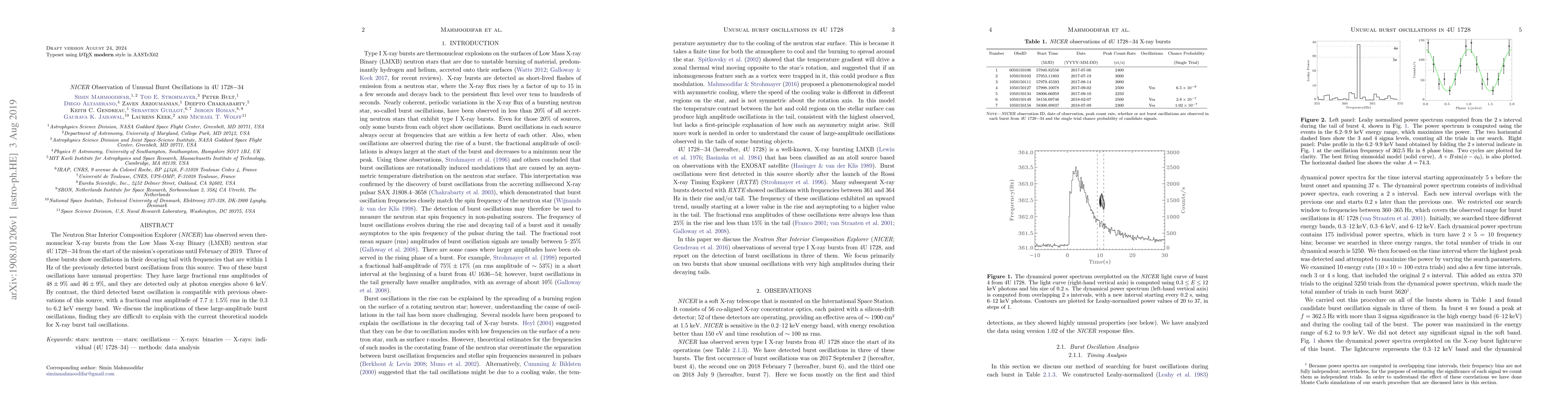 The NICER mission detected unusual oscillations in the X-ray bursts from the neutron star 4U 1728-34, with two bursts exhibiting large fractional amplitudes and being detectable only at high photon energies, challenging existing theoretical models. These anomalies suggest new physics or phenomena in neutron star burst oscillations.
