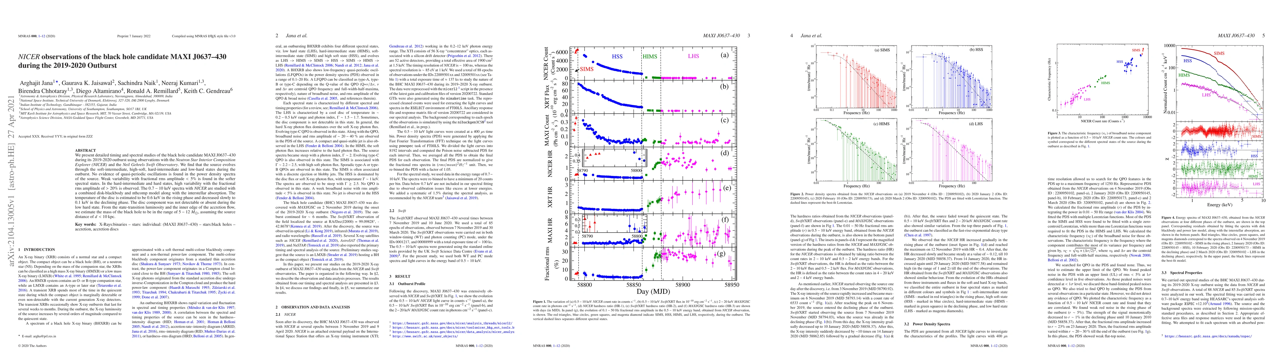 This study analyzes the black hole candidate MAXI J0637$-$430 during its 2019-2020 outburst using NICER and Swift Observatory data, revealing its evolution through various states with high variability in hard states and no quasi-periodic oscillations. The mass of the black hole is estimated to be between 5 and 12 solar masses.