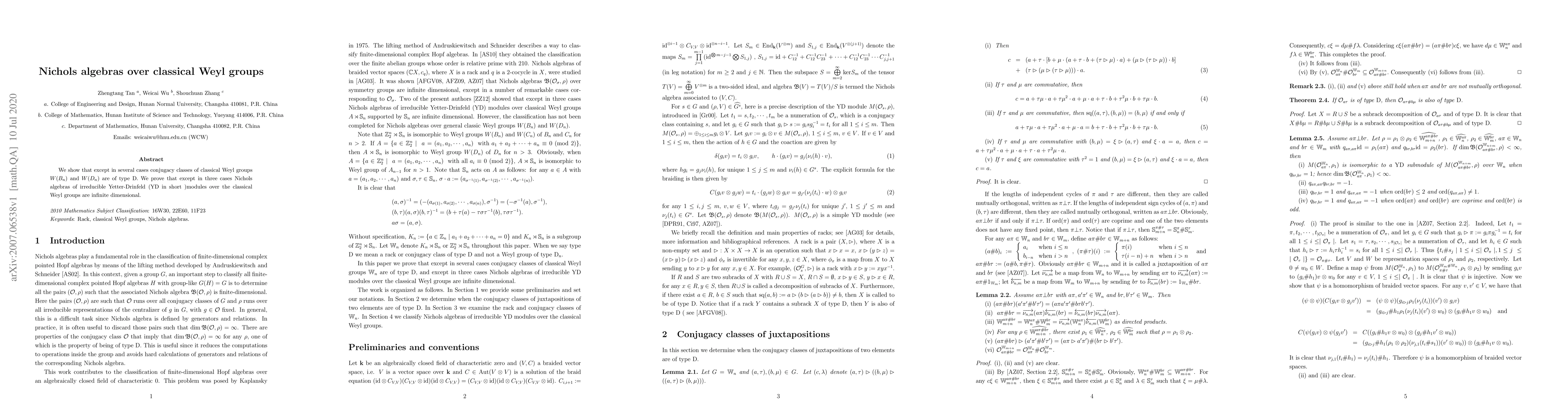 This paper demonstrates that, with few exceptions, conjugacy classes of classical Weyl groups $W(B_n)$ and $W(D_n)$ exhibit type D behavior. It also proves that Nichols algebras associated with irreducible Yetter-Drinfeld modules over these groups are infinite-dimensional, except in three specific cases.