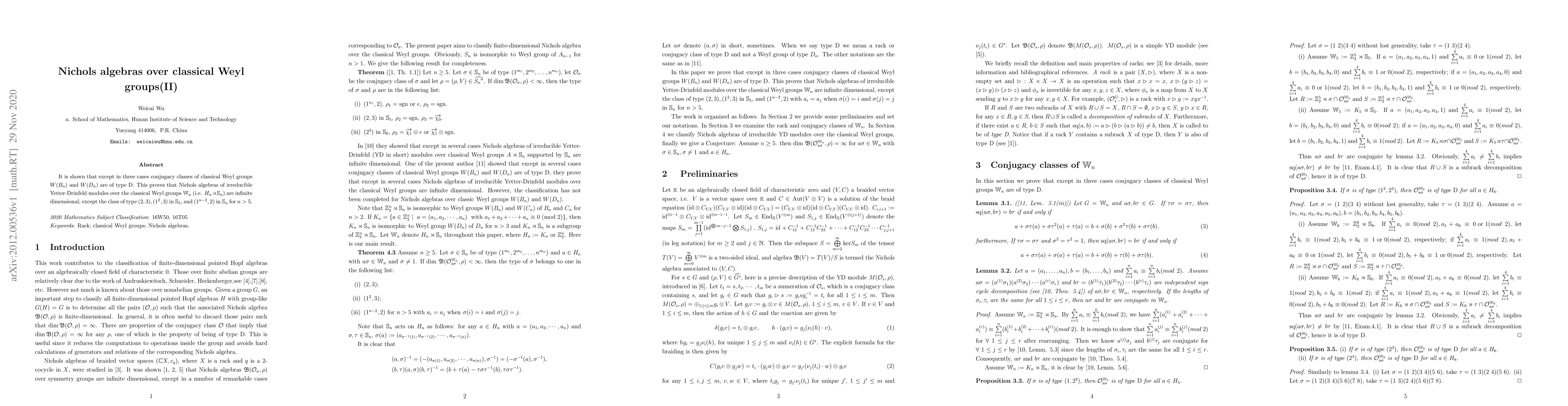 The research demonstrates that, barring three exceptions, conjugacy classes in classical Weyl groups $W(B_{n})$ and $W(D_{n})$ are of type ${\rm D}$. Consequently, Nichols algebras for irreducible Yetter-Drinfeld modules over these groups are infinite-dimensional, except for specific cases in $\mathbb S_{5}$ and $\mathbb S_{n}$ for $n >5$.