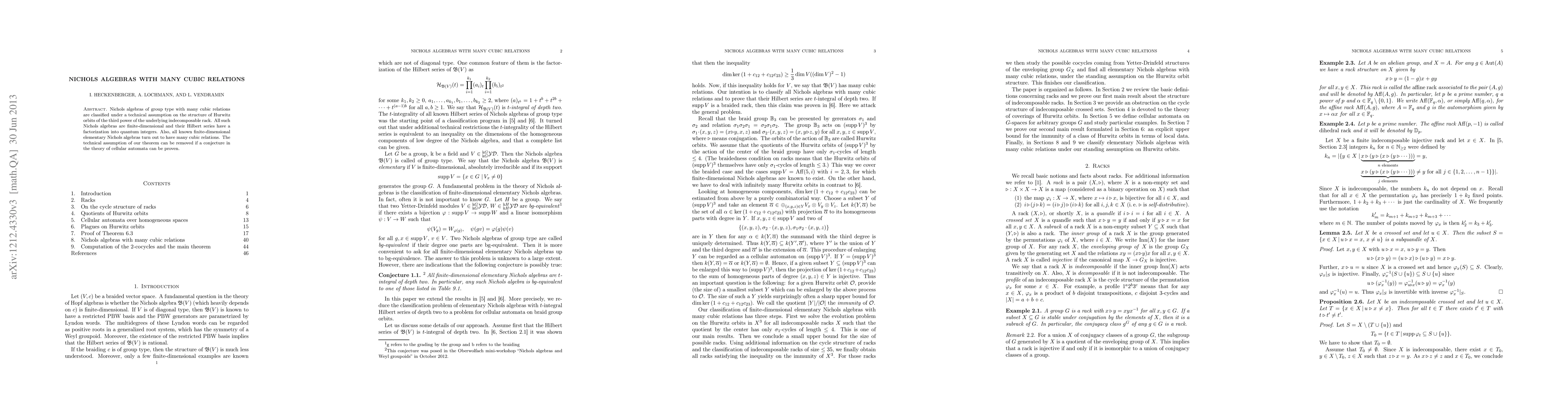 Nichols algebras of group type with many cubic relations are classified under a technical assumption on the structure of Hurwitz orbits of the third power of the underlying indecomposable rack. All such Nichols algebras are finite-dimensional and their Hilbert series have a factorization into quantum integers. Also, all known finite-dimensional elementary Nichols algebras of group type turn out to have many cubic relations. The technical assumption of our theorem can be removed if a conjecture in the theory of cellular automata can be proven.