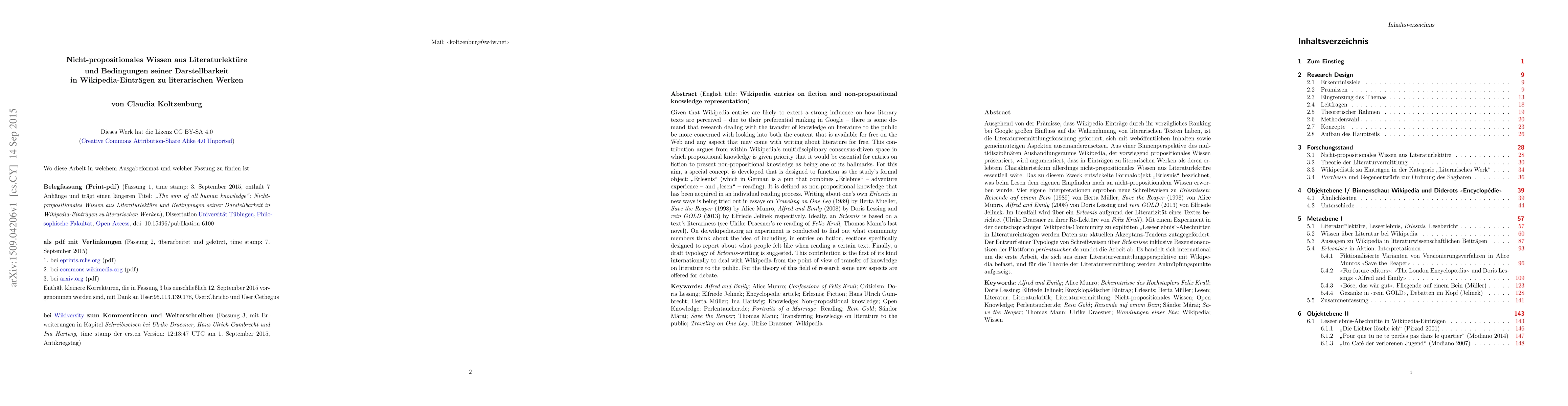 (English title) Wikipedia entries on fiction: Under what terms is it possible to report about non-propositional knowledge gained from reading? Given that Wikipedia entries are likely to extert a strong influence on how literary texts are perceived - due to their preferential ranking in Google - there is some demand that research dealing with the transfer of knowledge on literature to the public be more concerned with looking into both the content that is available for free on the Web and any aspect that may come with writing about literature for free. This contribution argues from within Wikipedia's multidisciplinary consensus-driven space in which propositional knowledge is given priority that it would be essential for entries on fiction to present non-propositional knowledge as being one of its hallmarks. For this aim, a special concept is developed that is designed to function as the study's formal object: "Erlesnis" (which in German is a pun that combines "Erlebnis" - adventure experience - and "lesen" - reading). It is defined as non-propositional knowledge that has been acquired in an individual reading process. Writing about one's own Erlesnis in new ways is being tried out in four essays, and on de.wikipedia.org an experiment is conducted to find out what community members think about the idea of including, in entries on fiction, sections specifically designed to report about what people felt like when reading a certain text. Finally, a draft typology of Erlesnis-writing is suggested. This contribution is the first of its kind internationally to deal with Wikipedia from the point of view of transfer of knowledge on literature to the public. For the theory of this field of research some new aspects are offered for debate.
